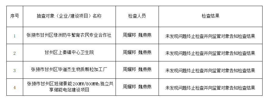 张掖市生态环境局甘州分局2025年10月“双随机、一公开”抽查检查结果公示(生态环境综合执法一体化管理平台)