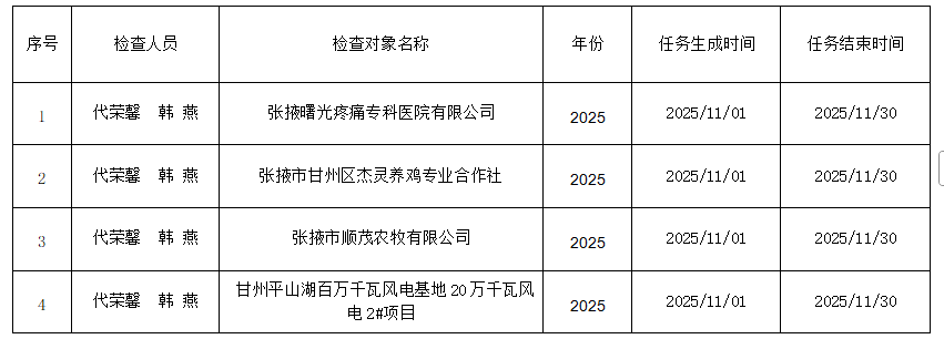张掖市生态环境局甘州分局2025年11月“双随机、一公开”抽取结果公示(生态环境综合执法一体化管理平台)