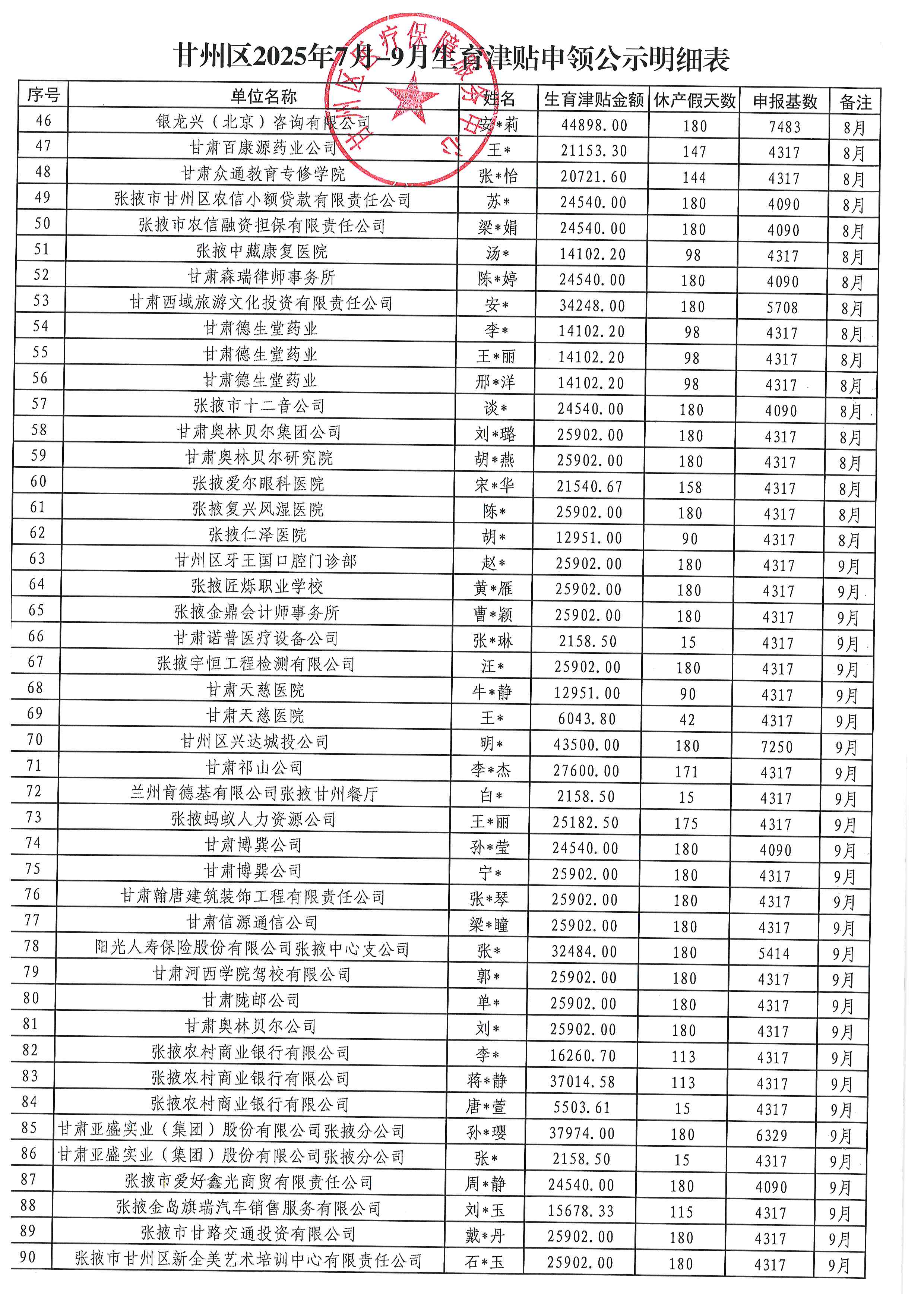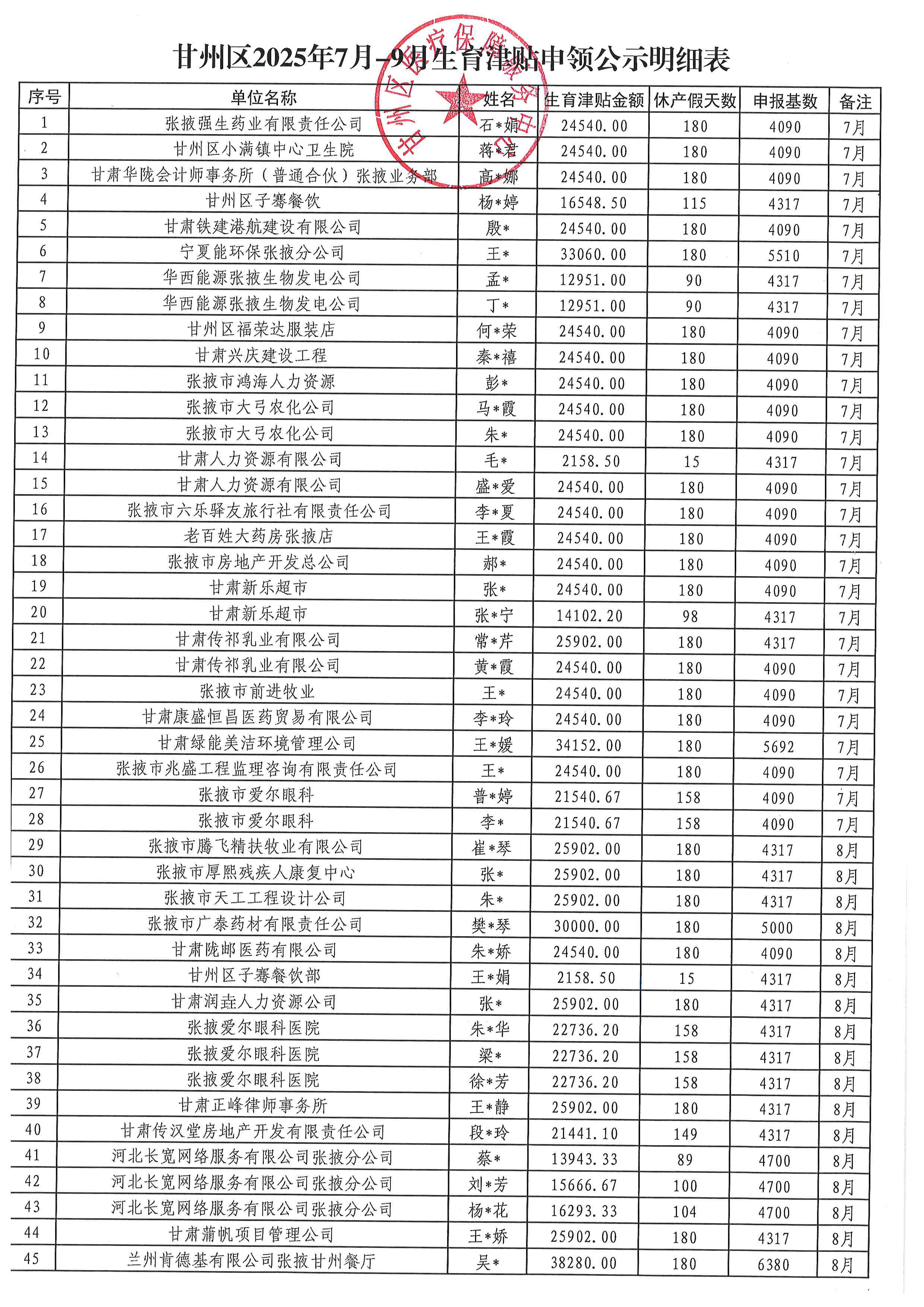 甘州区医疗保障服务中心 2025年7月-9月城镇职工生育津贴申领公示