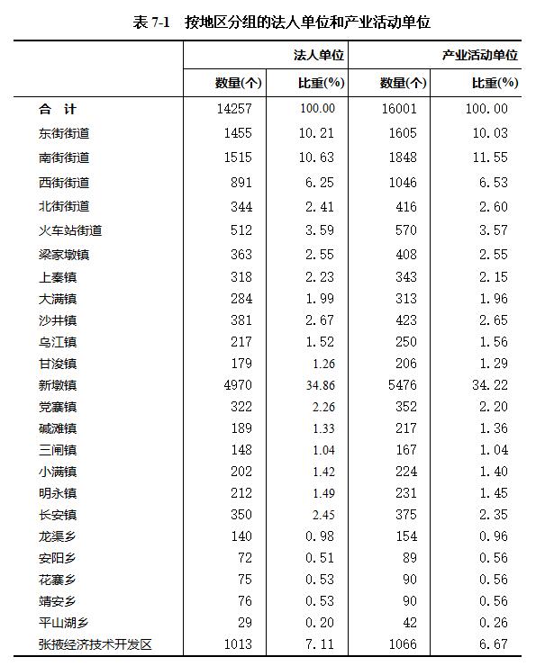2023年末,法人单位14257个,比2018年末的5712个增加了8545个,增长149.50%。其中;东街街道1455个,占10.21%,南街街道1515个,占10.63%,新墩镇4970个,占34.68%,张掖经济技术开发区1013个,占7.11%,西街街道891个,占6.25%,按地区分组的单位情况详见表7-1。