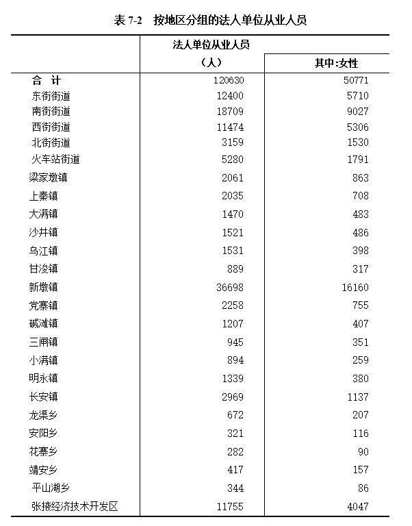 2023年末,法人单位从业人员:甘州区120630人,比2018年末的82225人增加了37564人,增长46.71%;按地区分组的法人单位从业人员情况详见表7-2。