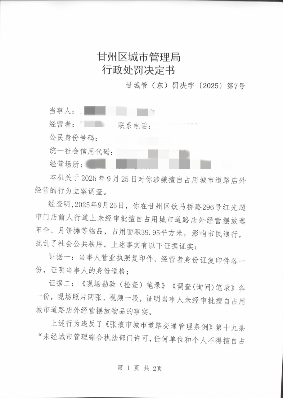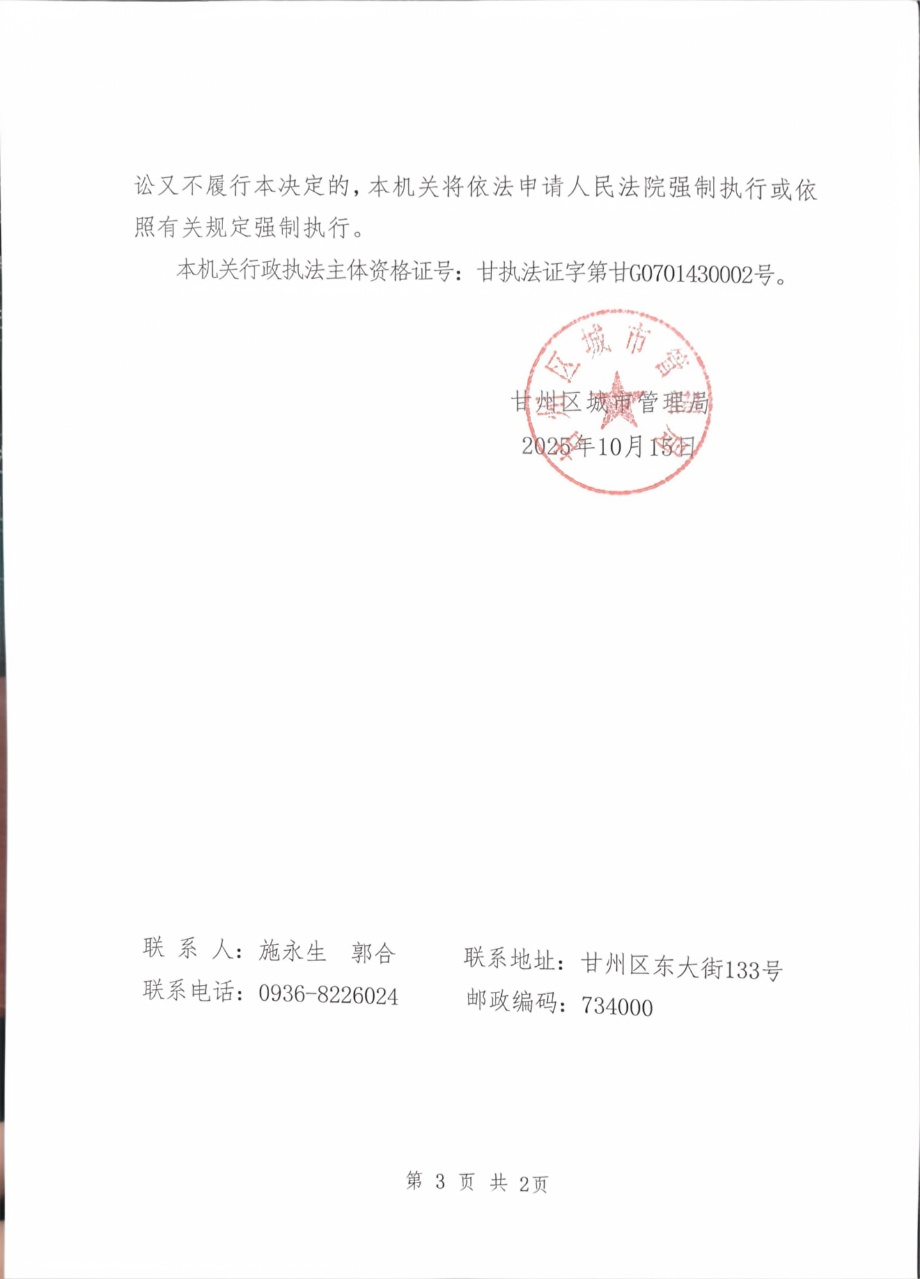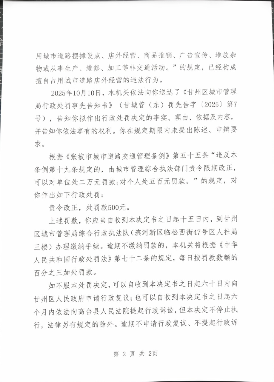 甘州区城市管理局行政处罚决定书