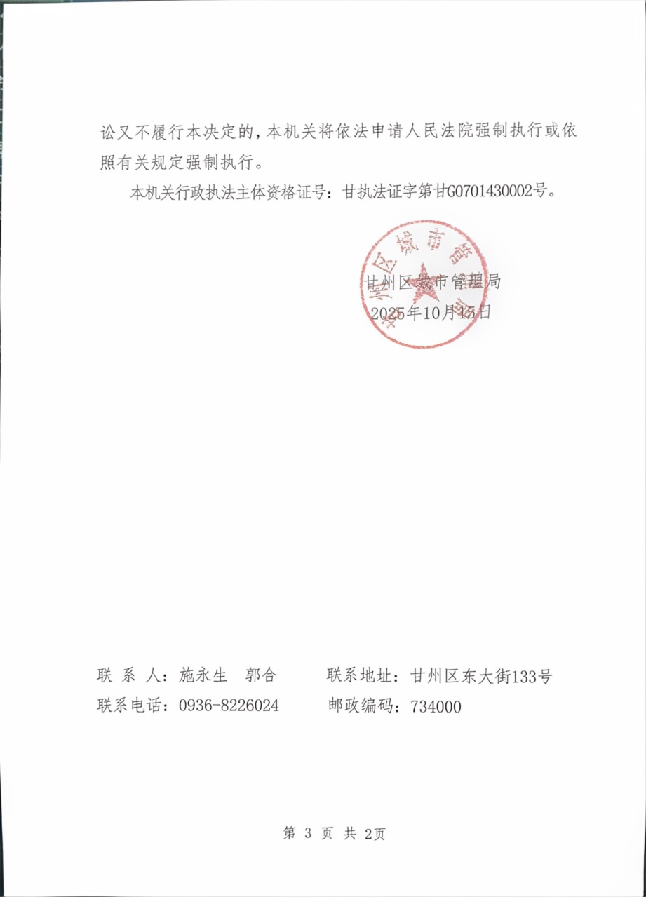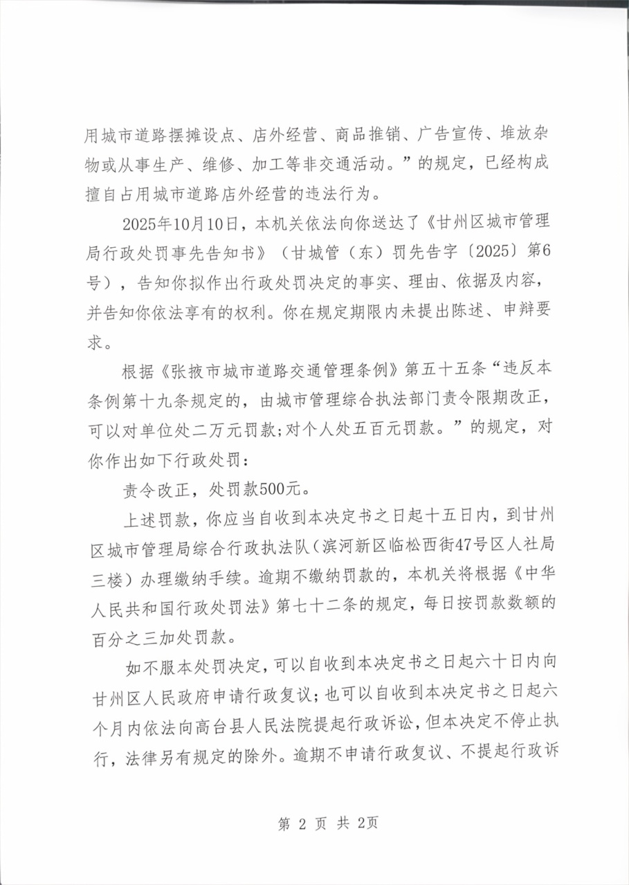 甘州区城市管理局行政处罚决定书