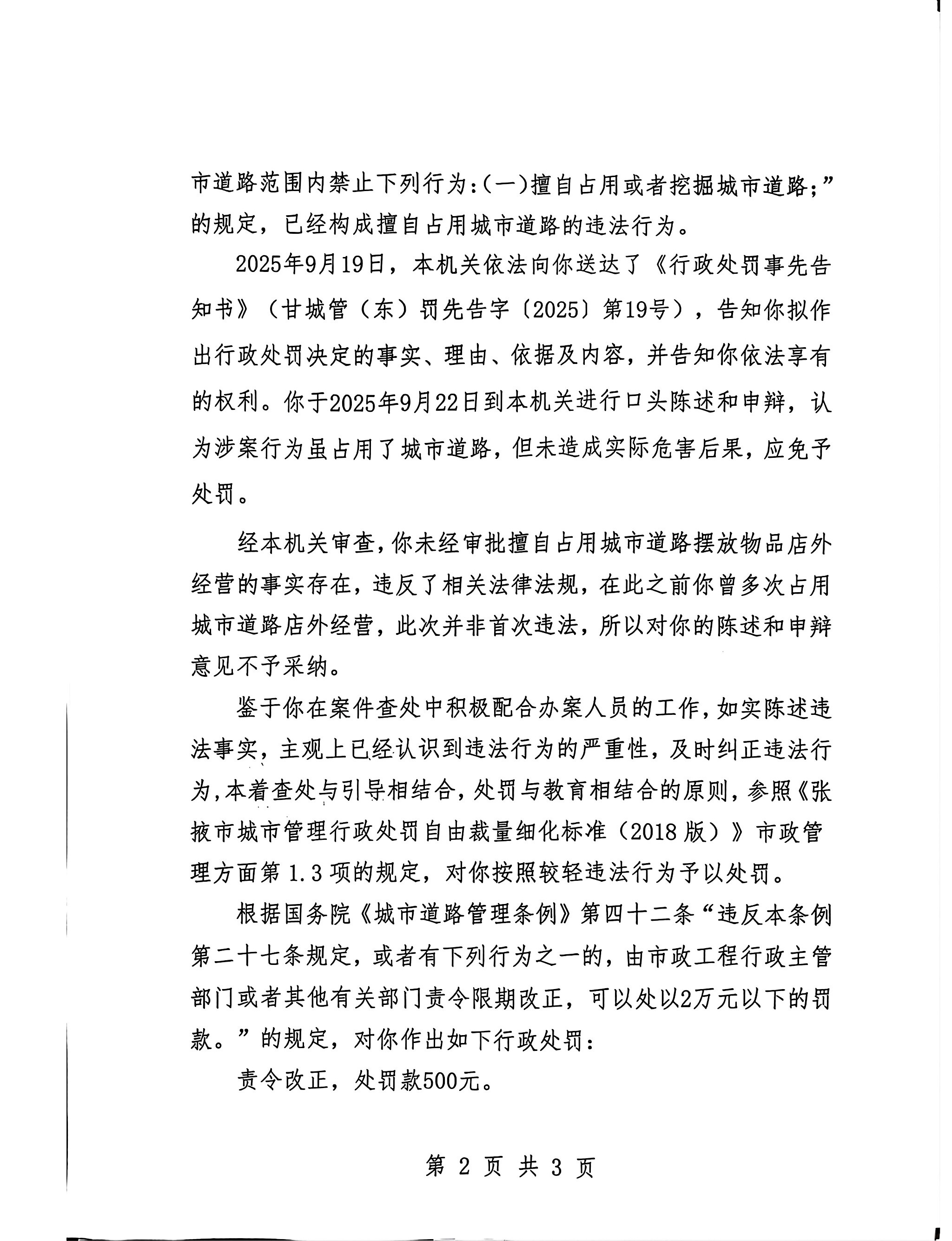 甘州区城市管理局行政处罚决定书