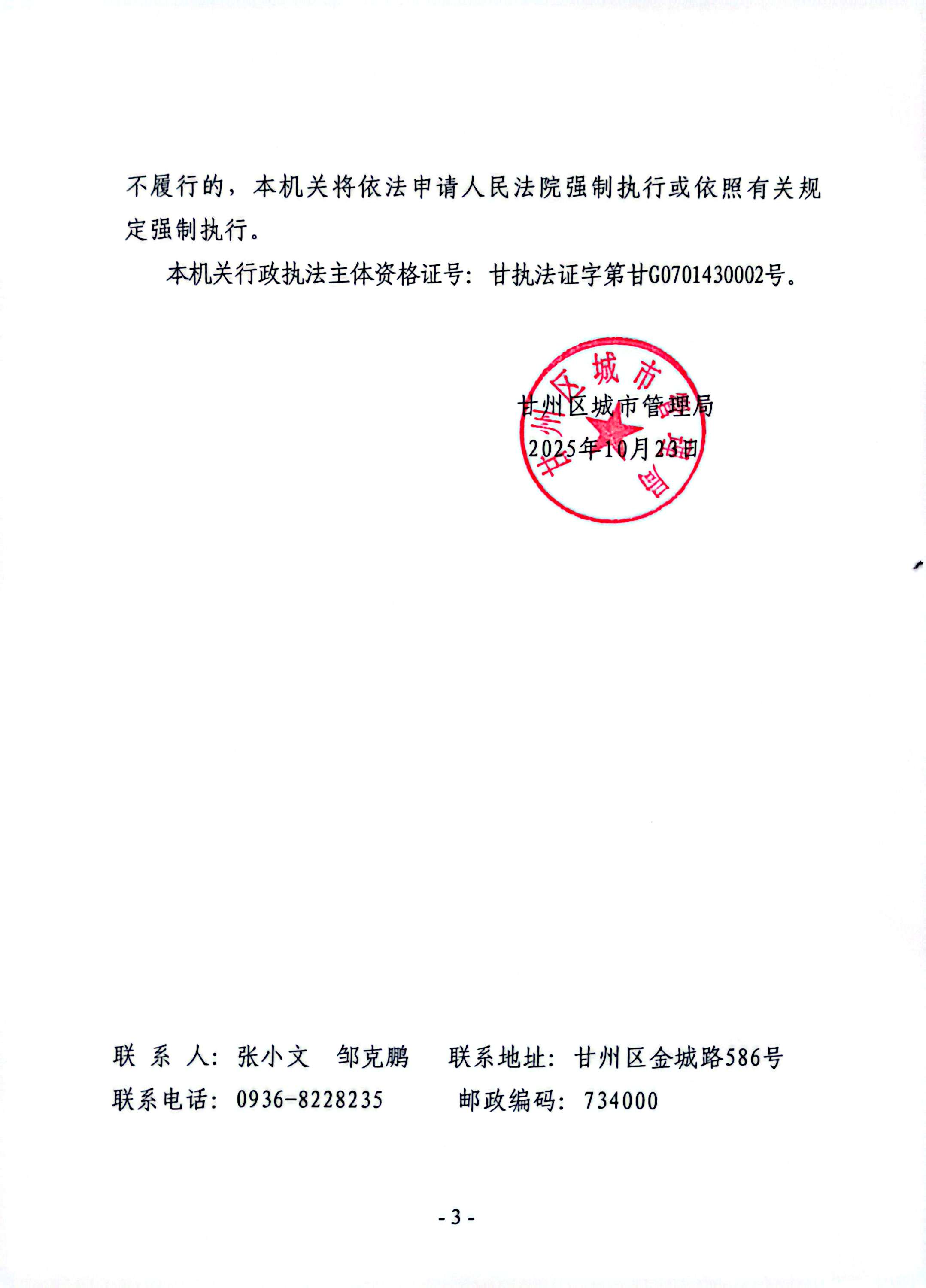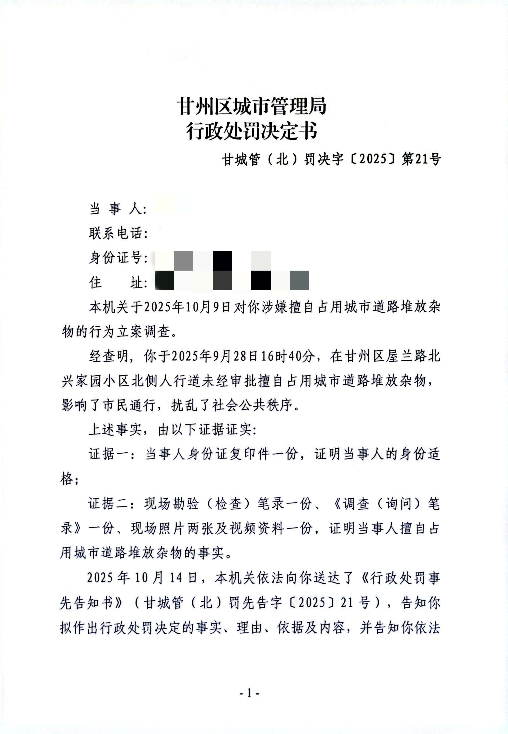 甘城管(北)罚决字〔2025〕第21号