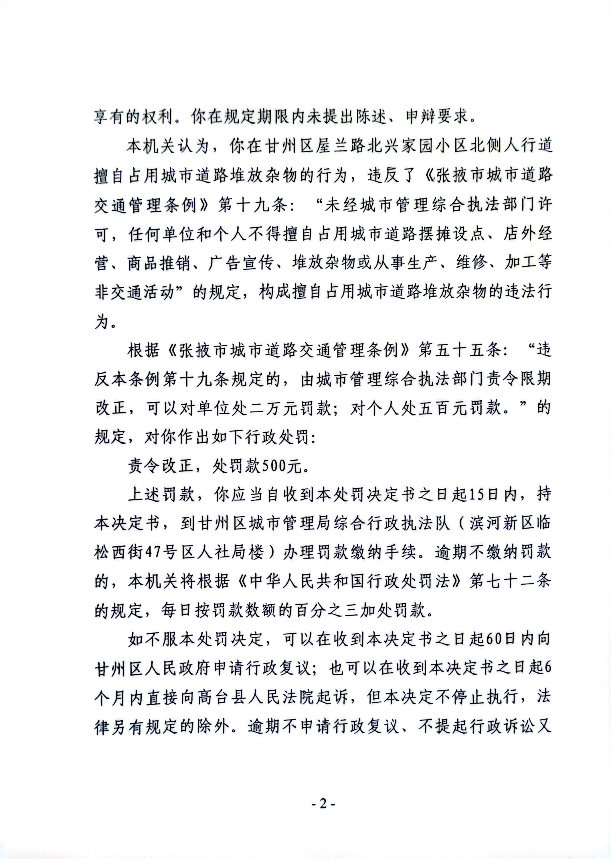 甘州区城市管理局行政处罚决定书