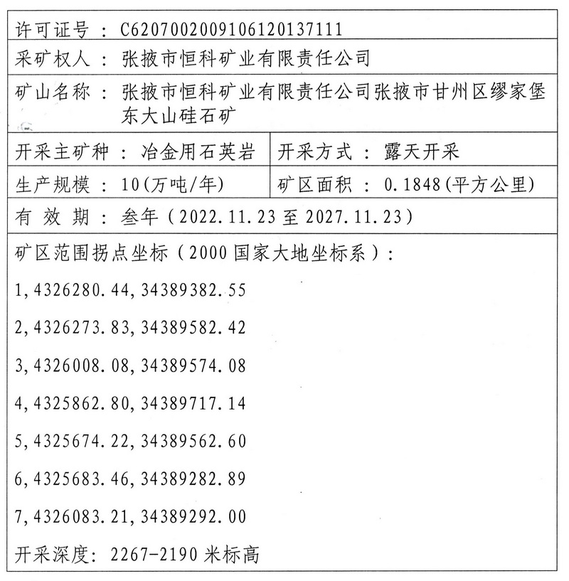 张掖市恒科矿业有限责任公司(原张掖市甘州区缪家堡东大山硅石矿)申请对原张掖市甘州区缪家堡东大山硅石矿采矿权进行延续变更登记,目前登记手续已完成。根据《矿产资源开采登记管理办法》(国务院令第241号)第8条规定,现对该采矿许可证矿区范围予以公告。
