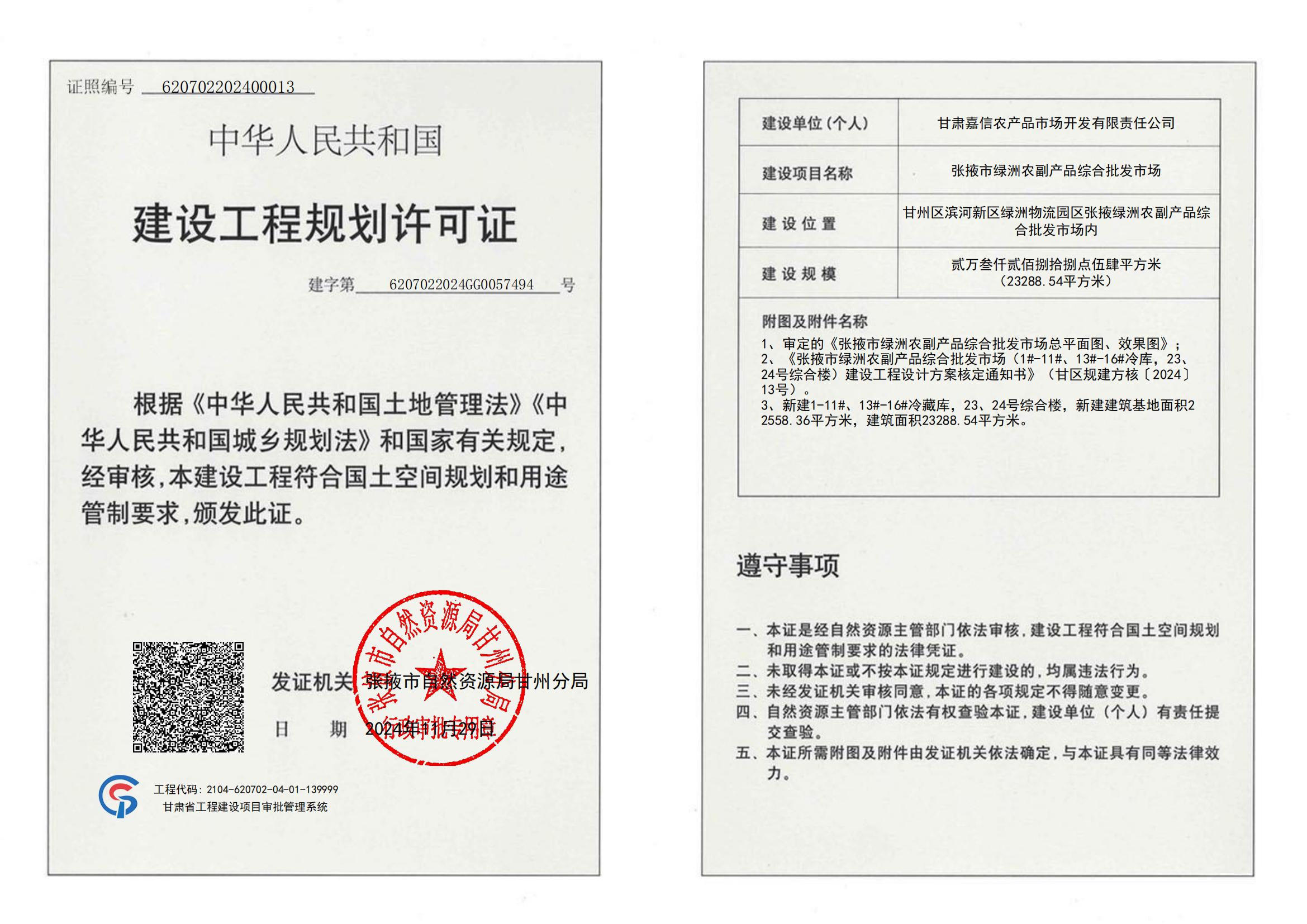 张掖市绿洲农副产品综合批发市场建设工程规划许可证公示