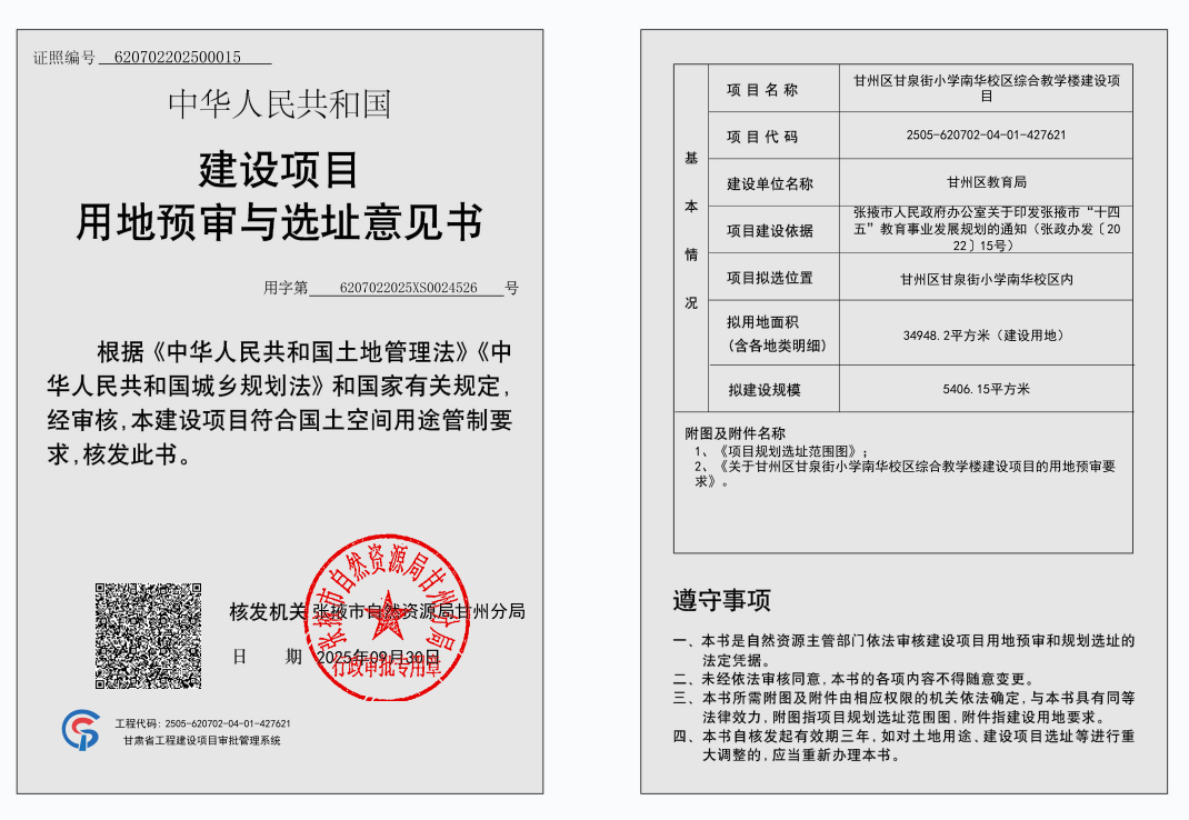 甘州区甘泉街小学南华校区综合教学楼建设项目用地预审与选址意见书批后公示