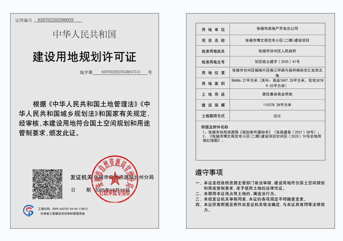 张掖市博文苑住宅小区(二期)建设项目用地规划许可证批后公示