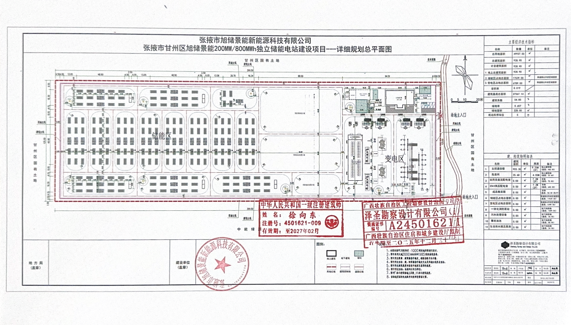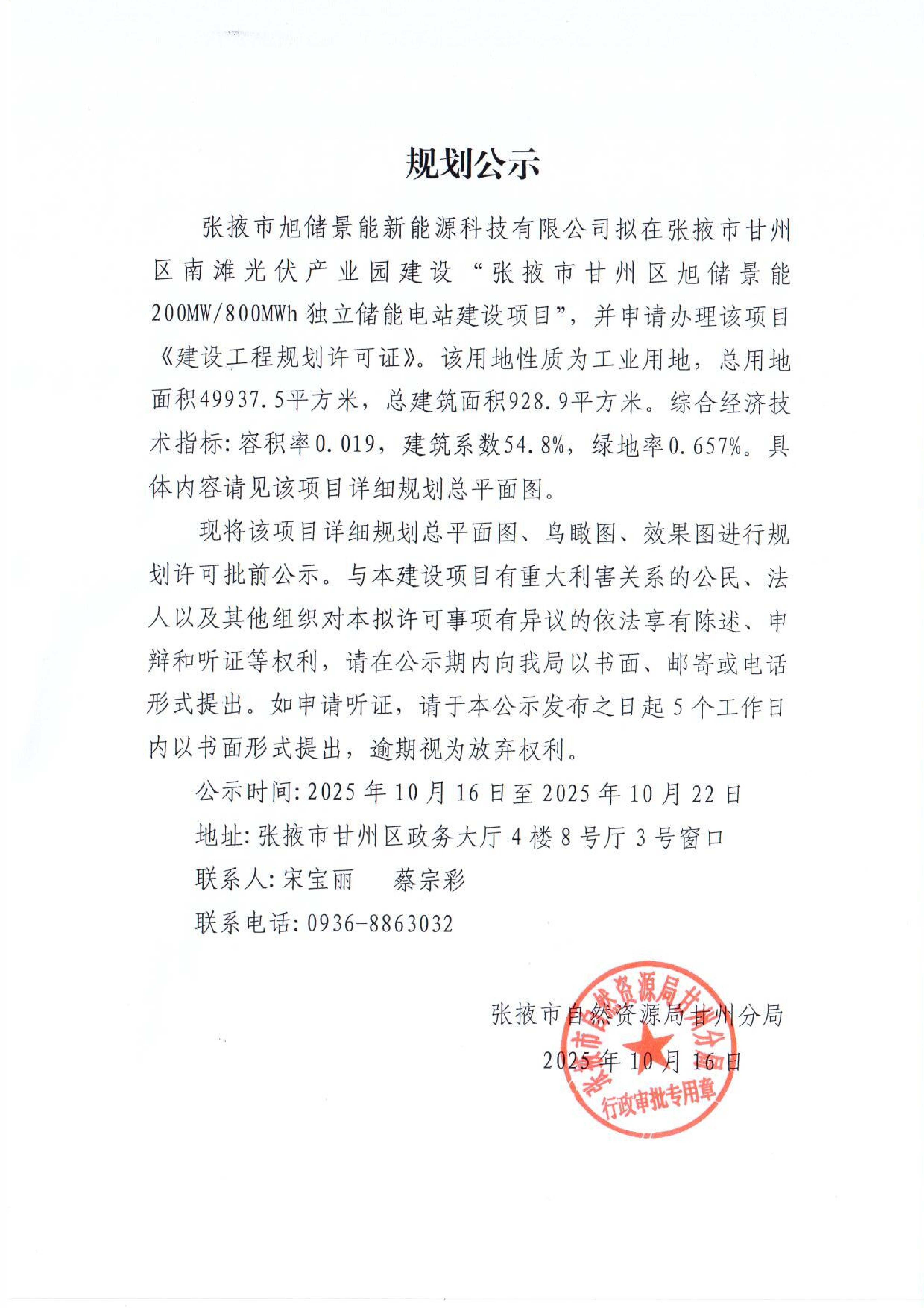 张掖市甘州区旭储景能200MW/800MWh独立储能电站建设项目规划批前公示