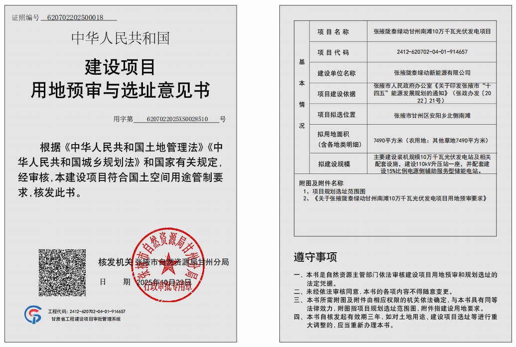 张掖陇泰绿动甘州南滩10万千瓦光伏发电项目建设项目用地预审与选址意见书批后公示