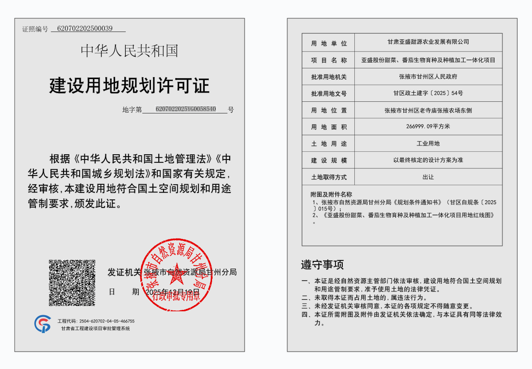 亚盛股份甜菜、番茄生物育种及种植加工一体化项目建设用地规划许可证批后公示