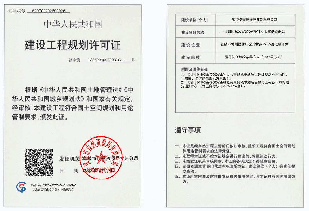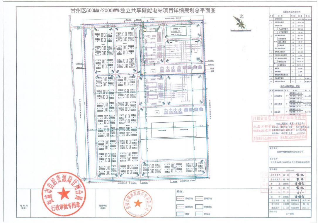 甘州区500MW/2000MWh独立共享储能电站建设工程规划许可证批后公示