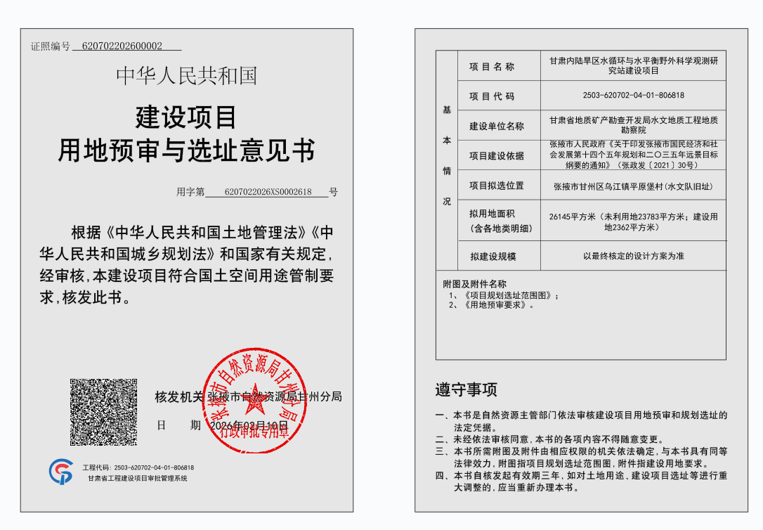 甘肃内陆旱区水循环与水平衡野外科学观测研究站建设项目用地预审与选址意见书批后公示