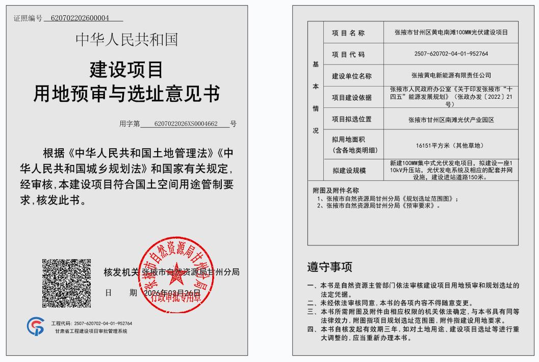 张掖市甘州区黄电南滩100MW光伏建设项目用地预审与选址意见书公示