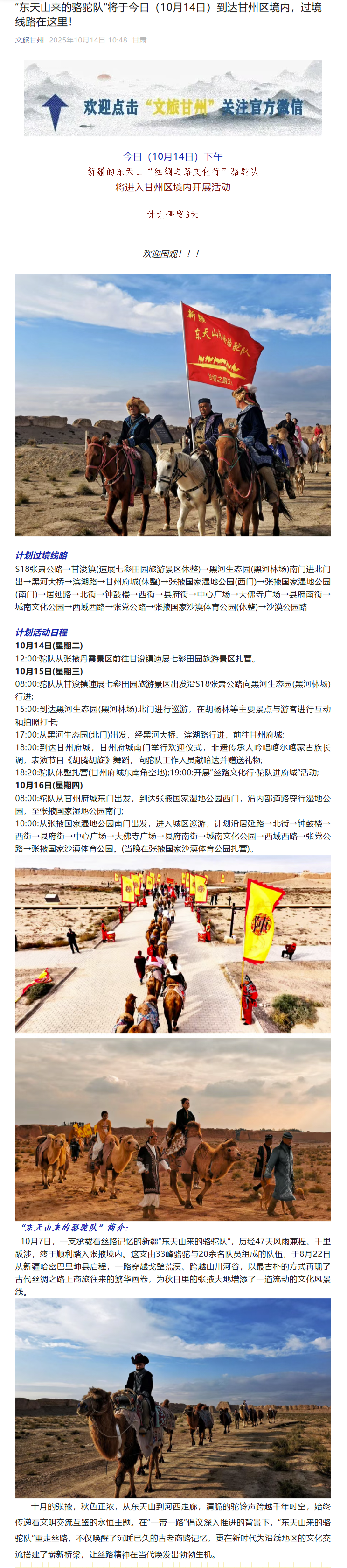 “东天山来的骆驼队”将于今日(10月14日)到达甘州区境内,过境线路在这里!