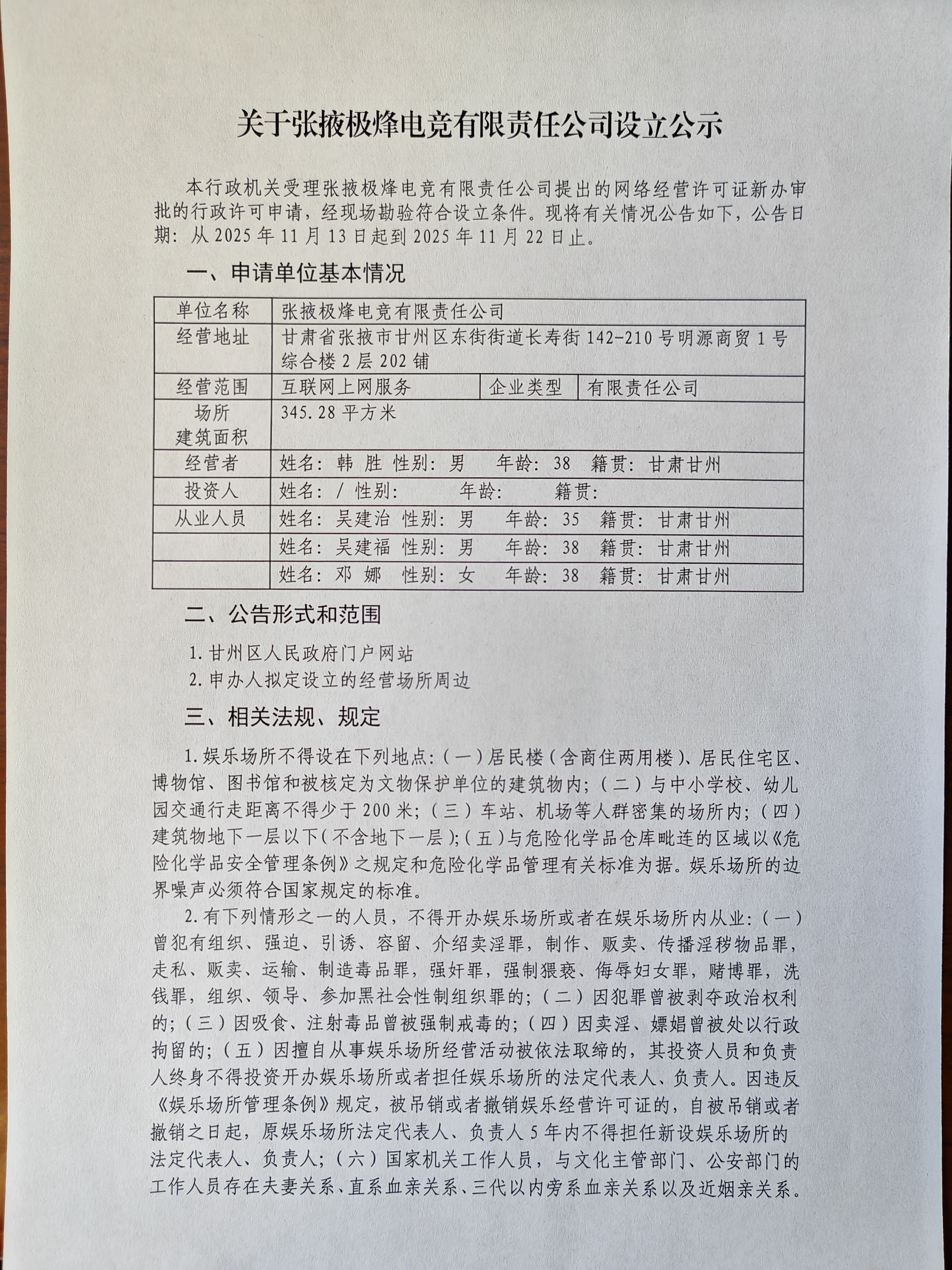 关于张掖极烽电竞有限责任公司设立的公示