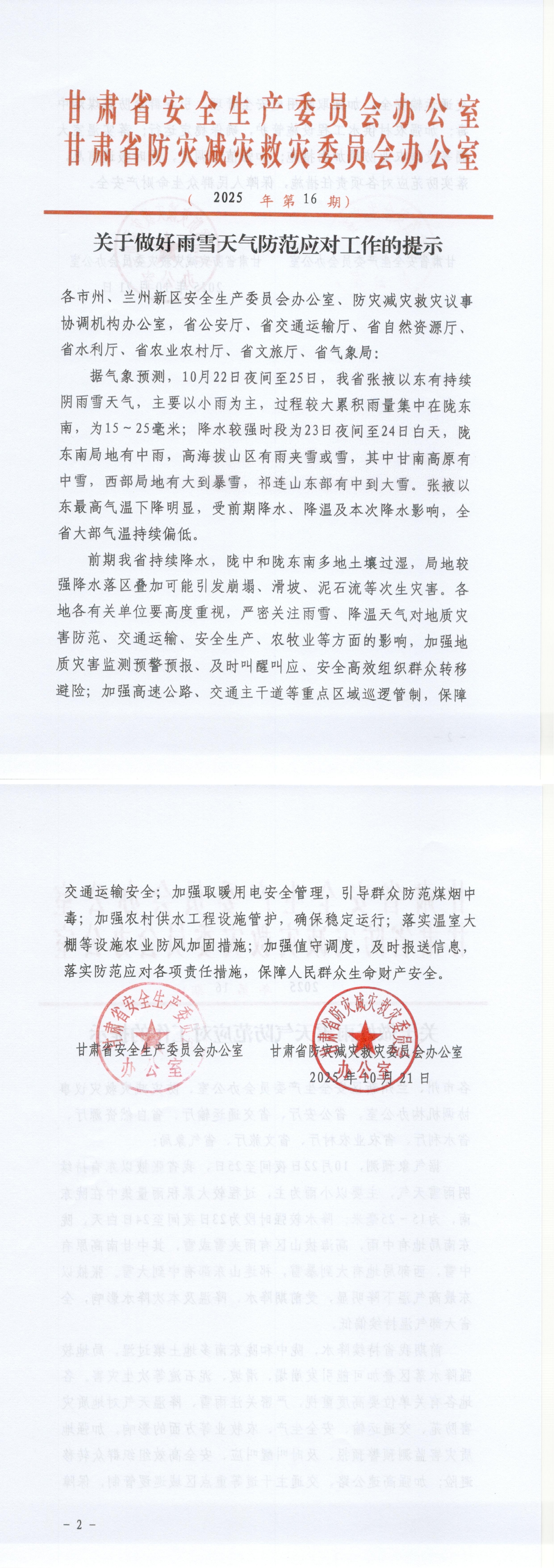甘肃省安全生产委员会办公室甘肃省防灾减灾救灾委员会办公室关于做好雨雪天气防范应对工作的通知