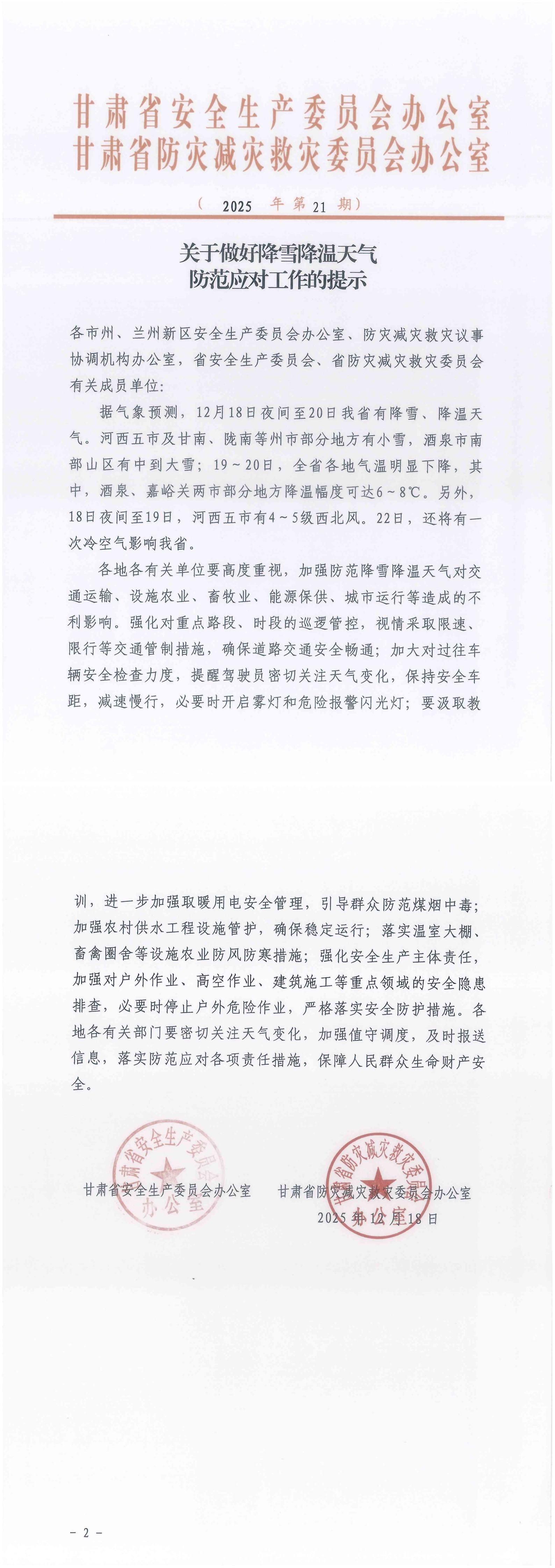 甘肃省安全生产委员会办公室甘肃省防灾减灾救灾委员会办公室关于做好降雪降温天气防范应对工作的提示