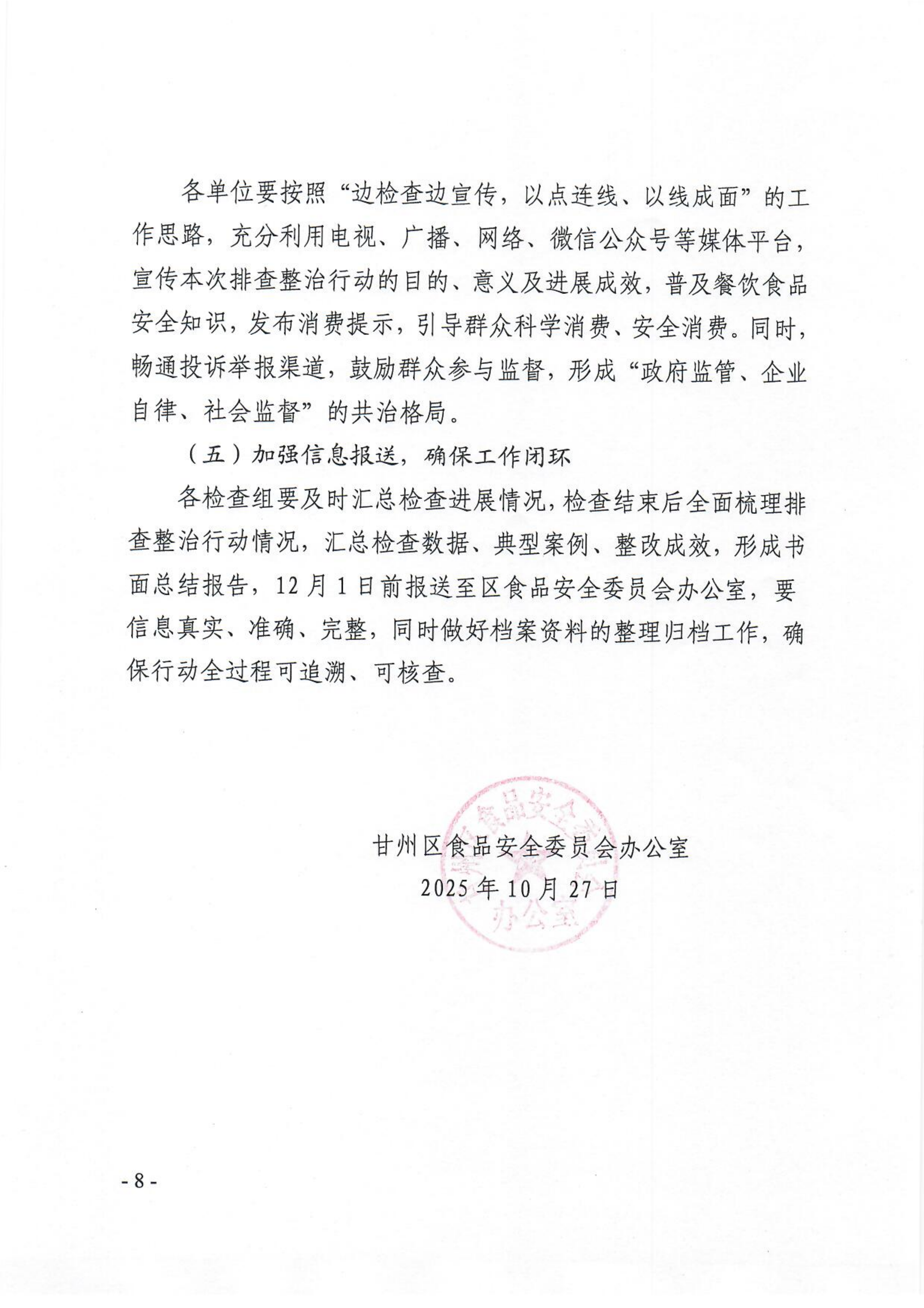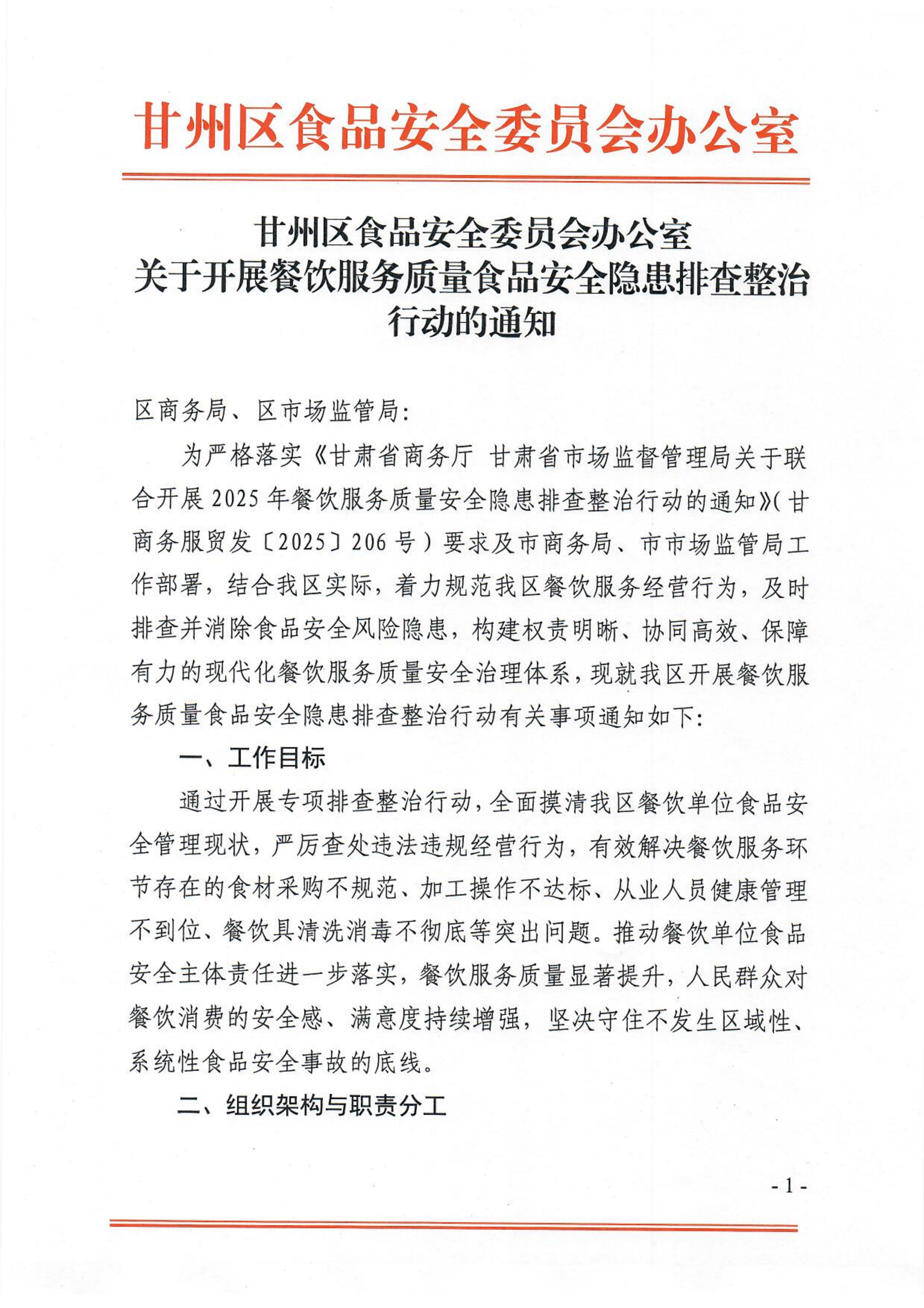 甘州区食品安全委员会办公室关于开展餐饮服务质量食品安全隐患排查整治行动的通知