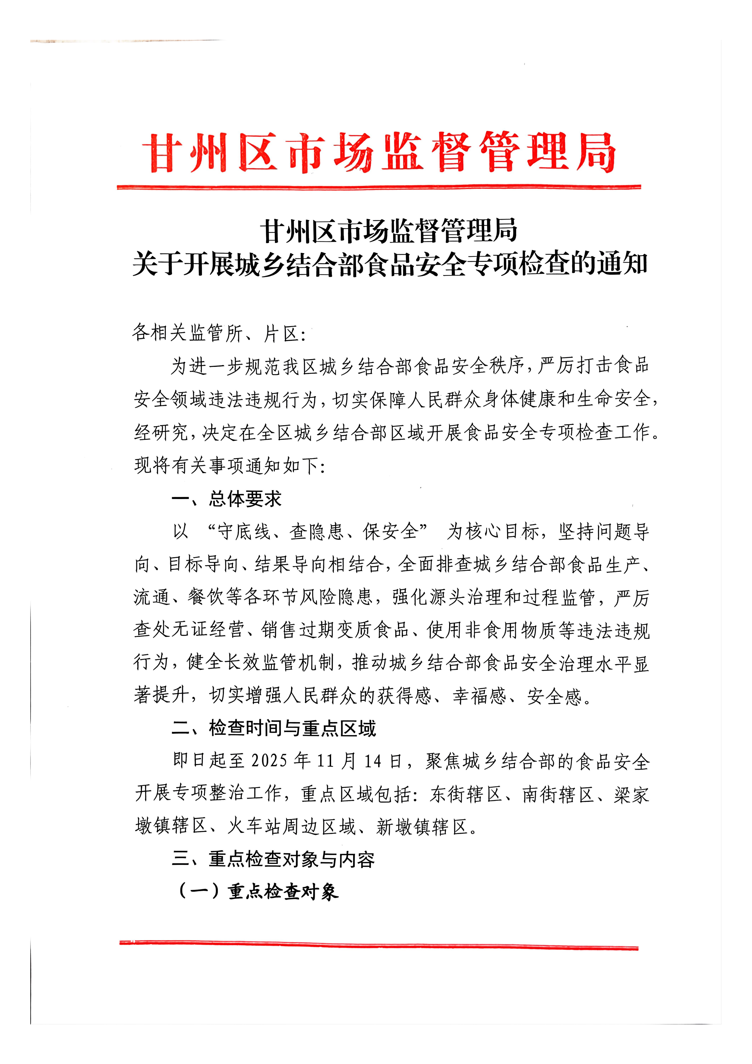 甘州区市场监督管理局关于开展城乡结合部食品安全专项检查的通知