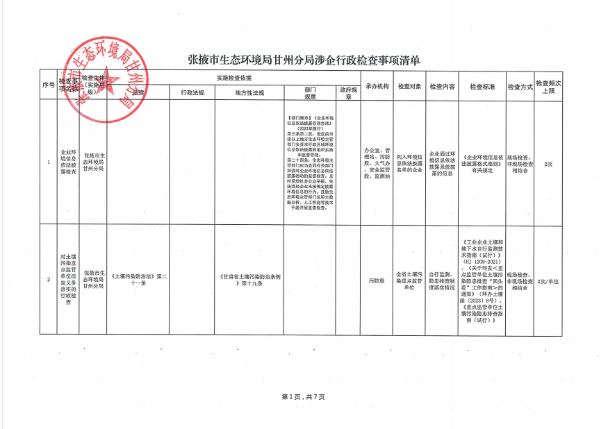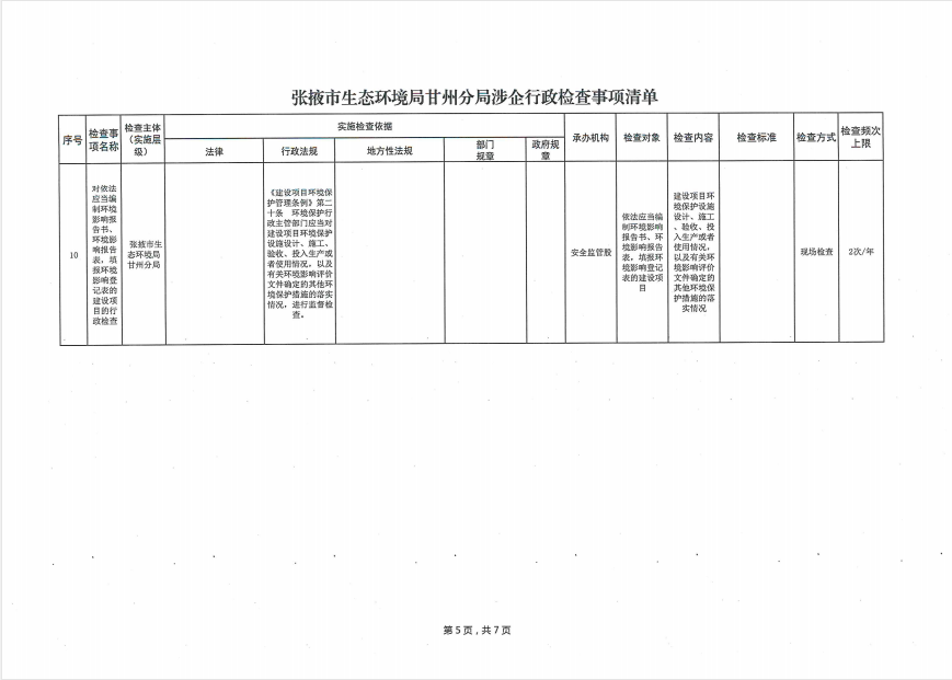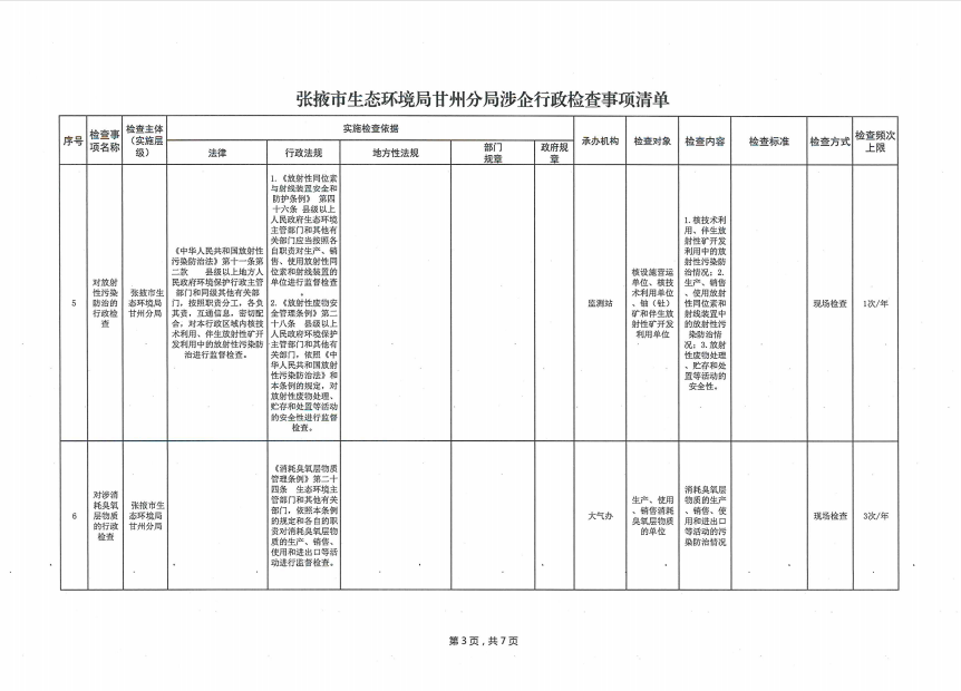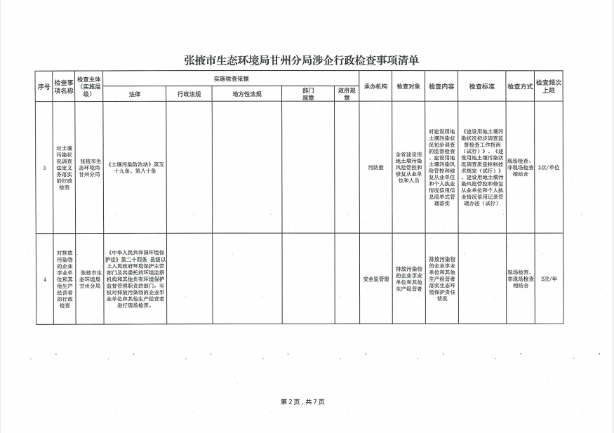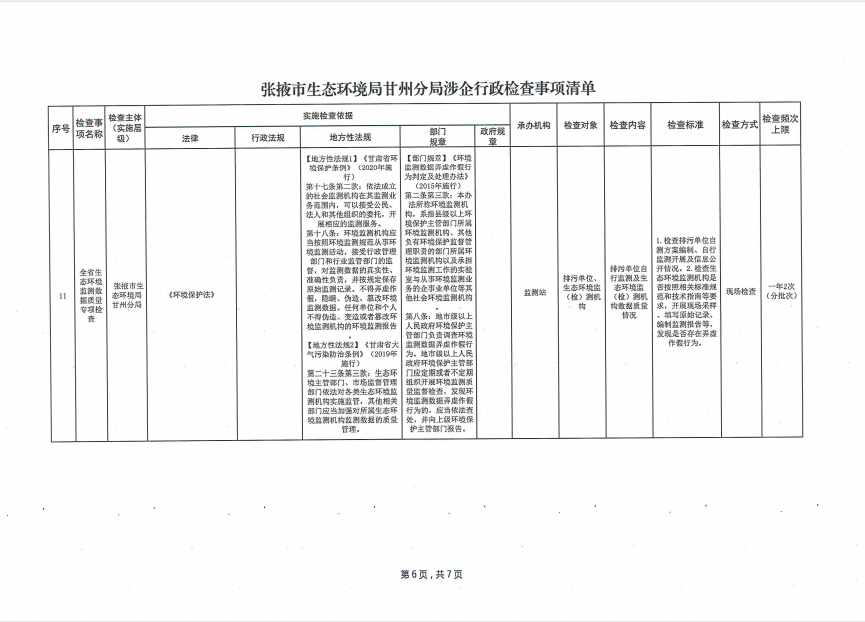 张掖市生态环境局甘州分局涉企行政检查事项清单