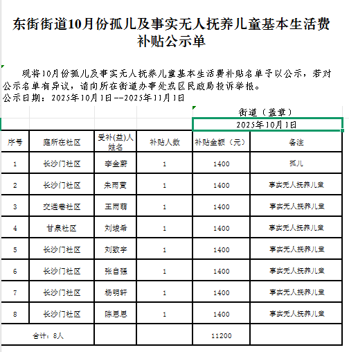 东街街道10月份孤儿及事实无人抚养儿童基本生活费补贴公示