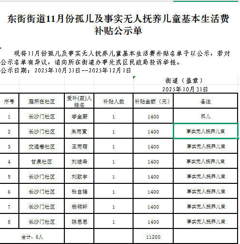 东街街道11月份孤儿及事实无人抚养儿童基本生活费补贴公示