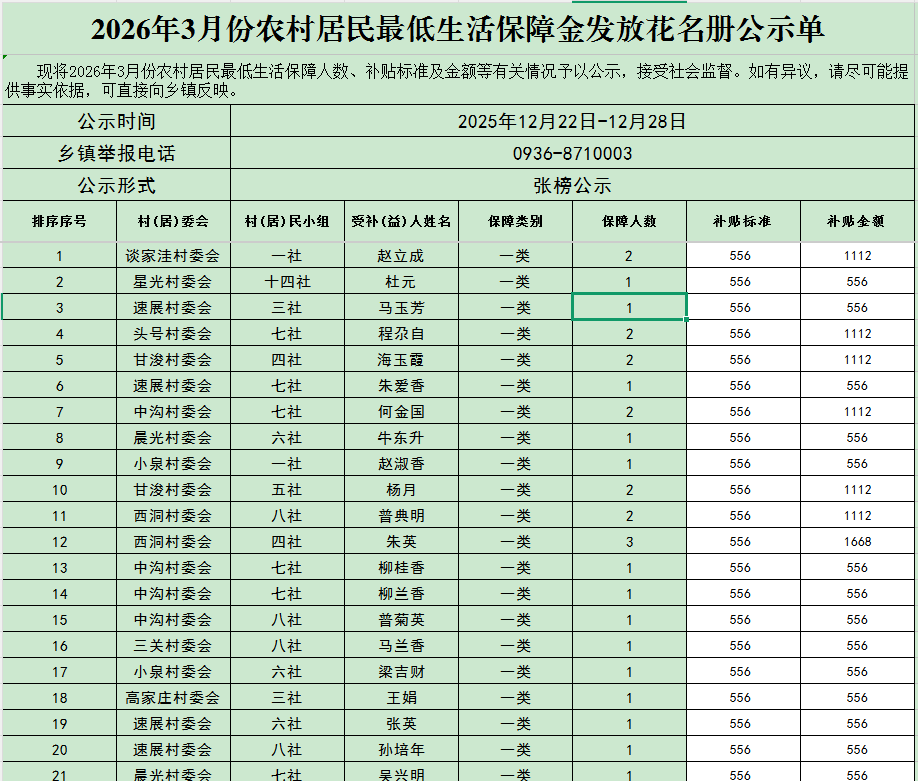 2026年3月份农村居民最低生活保障金发放花名册公示单