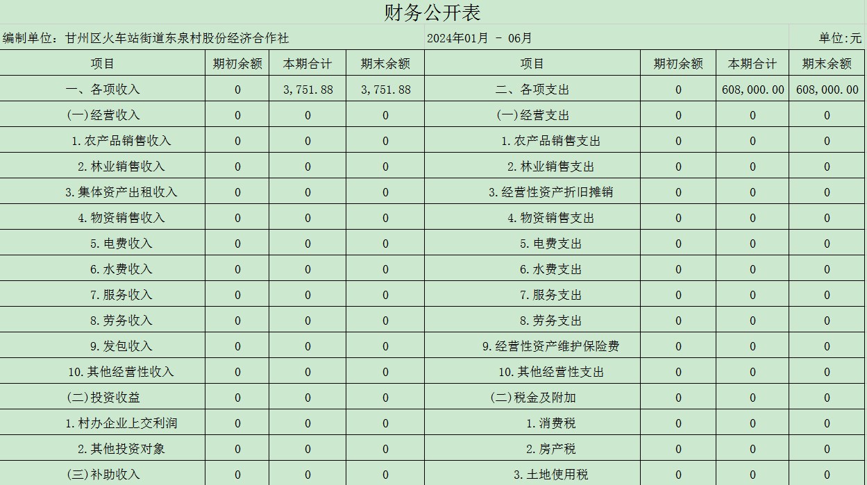 现将火车站街道东泉村2024年二季度财务公开,接受广大居民群众的监督。