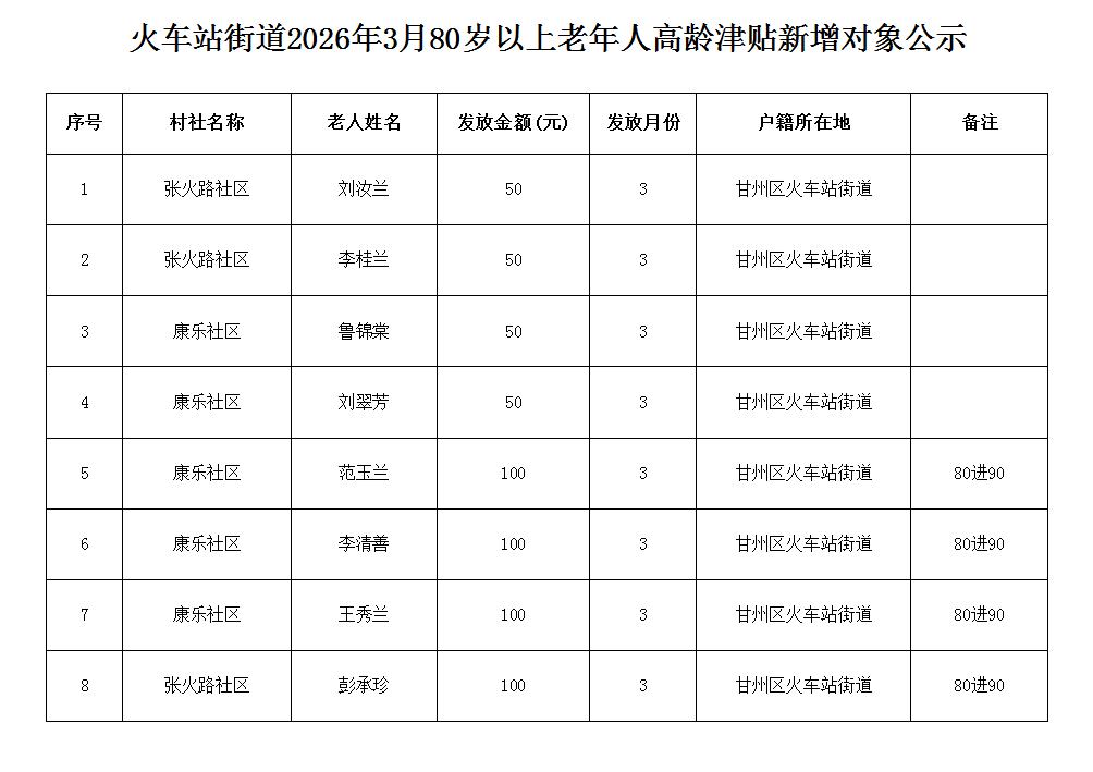 火车站街道2026年3月80岁以上老年人高龄津贴新增对象公示