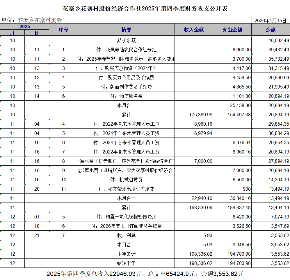 花寨乡花寨村股份经济合作社2025年第四季度财务收支公开