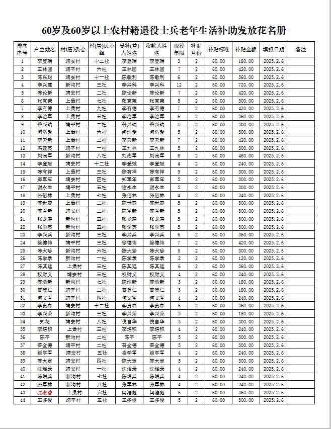 靖安乡60岁及60岁以上农村籍退役士兵老年生活补助发放花名册