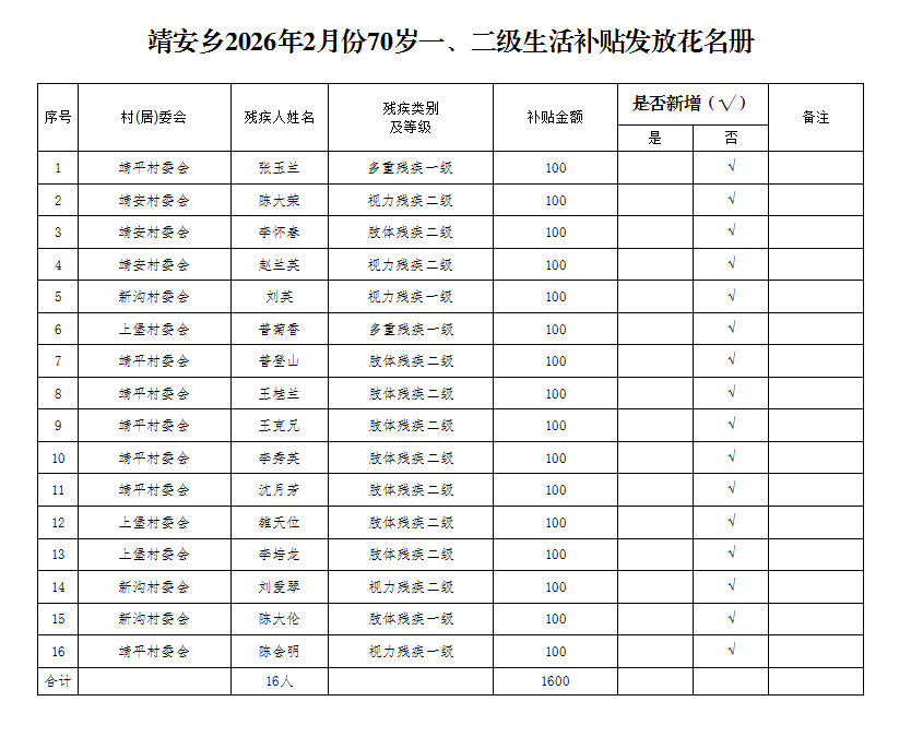 靖安乡2026年2月份70岁一、二级生活补贴发放花名册