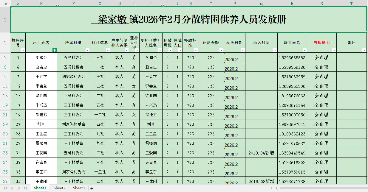 梁家墩镇2026年2月特困分散供养补助发放表