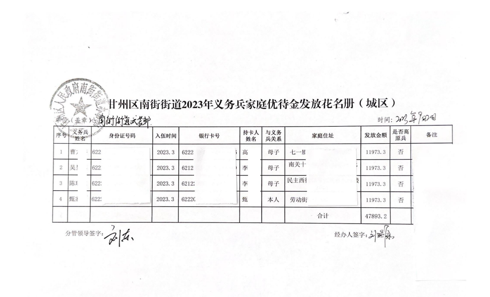 南街街道9月义务兵家庭优待金发放