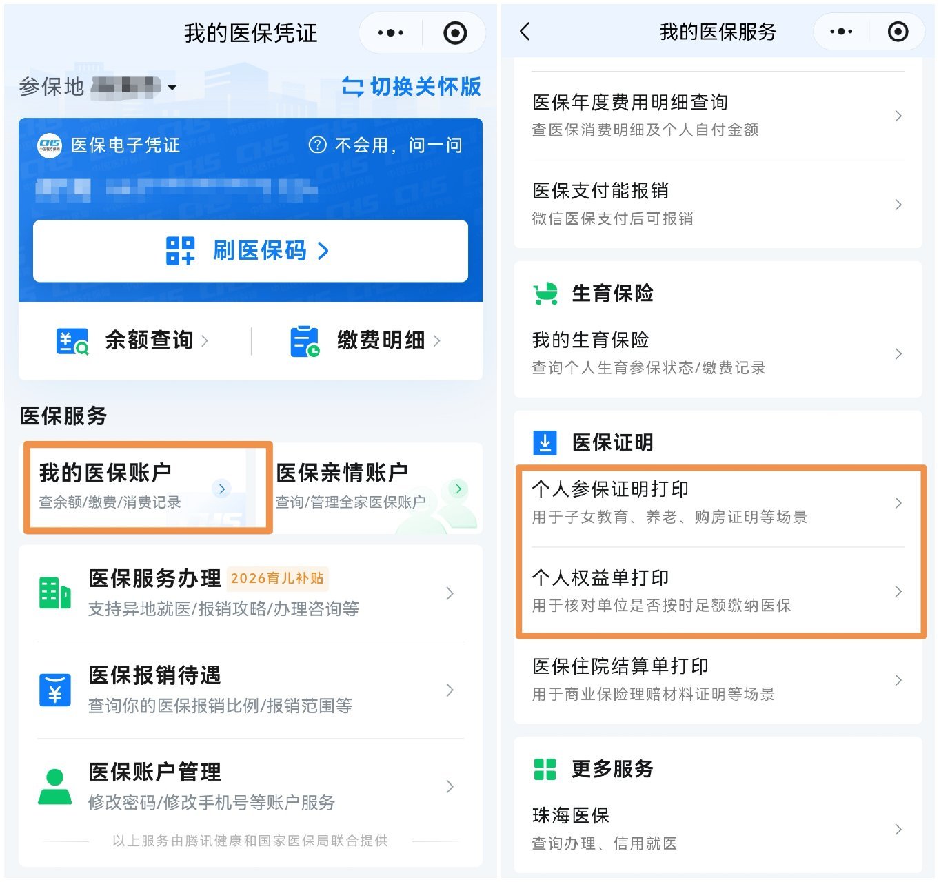 医保: 1️⃣ 微信搜索“我的医保凭证”,点击“我的医保账户”,如图2所示,再下滑找到“医保证明”栏。 2️⃣ “个人参保证明”也是查询医保在哪交的,交了几个月。 “个人权益单打印”是医保缴费明细,包括基本医疗、生育分别交了多少。