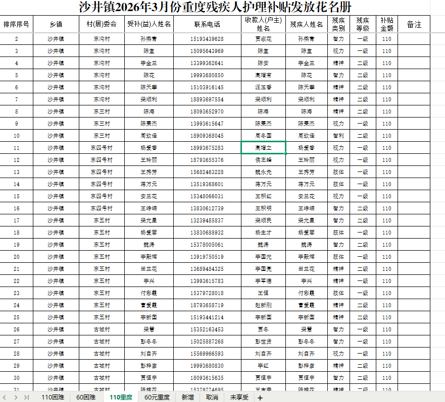 沙井镇2026年3月份重度残疾人护理补贴发放花名册