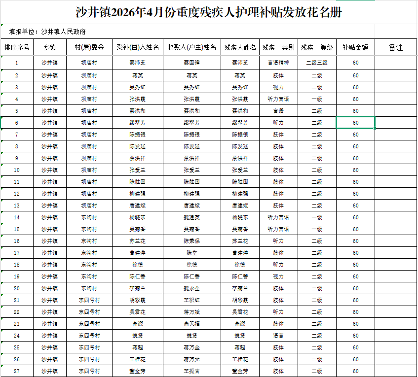 沙井镇2026年4月份重度残疾人护理补贴发放花名册