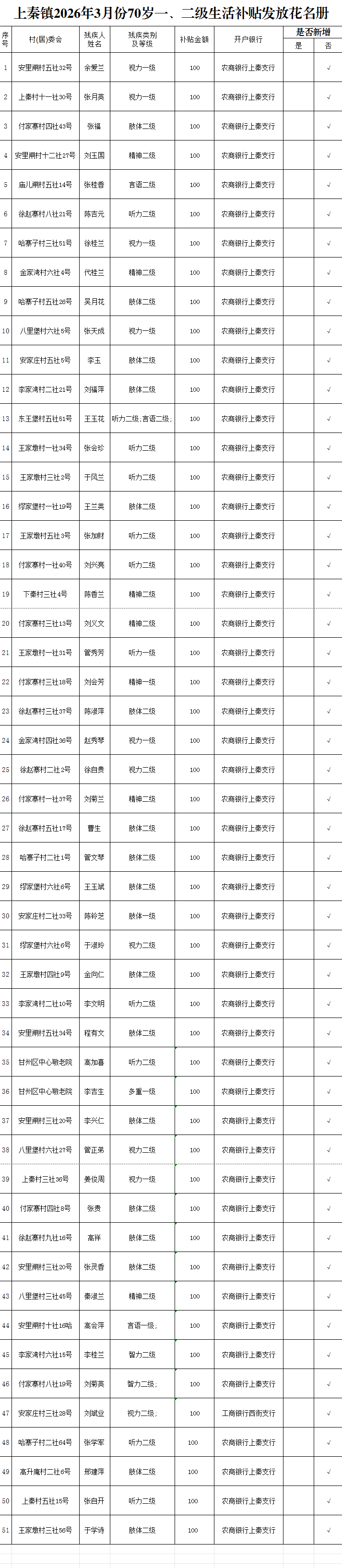 上秦镇2026年3月份70岁一、二级生活补贴发放花名册