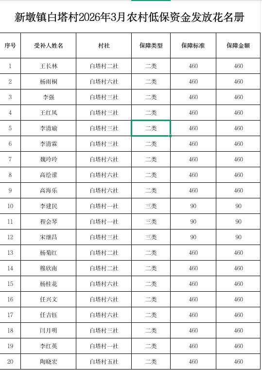 新墩镇白塔村2026年3月农村低保资金发放花名册