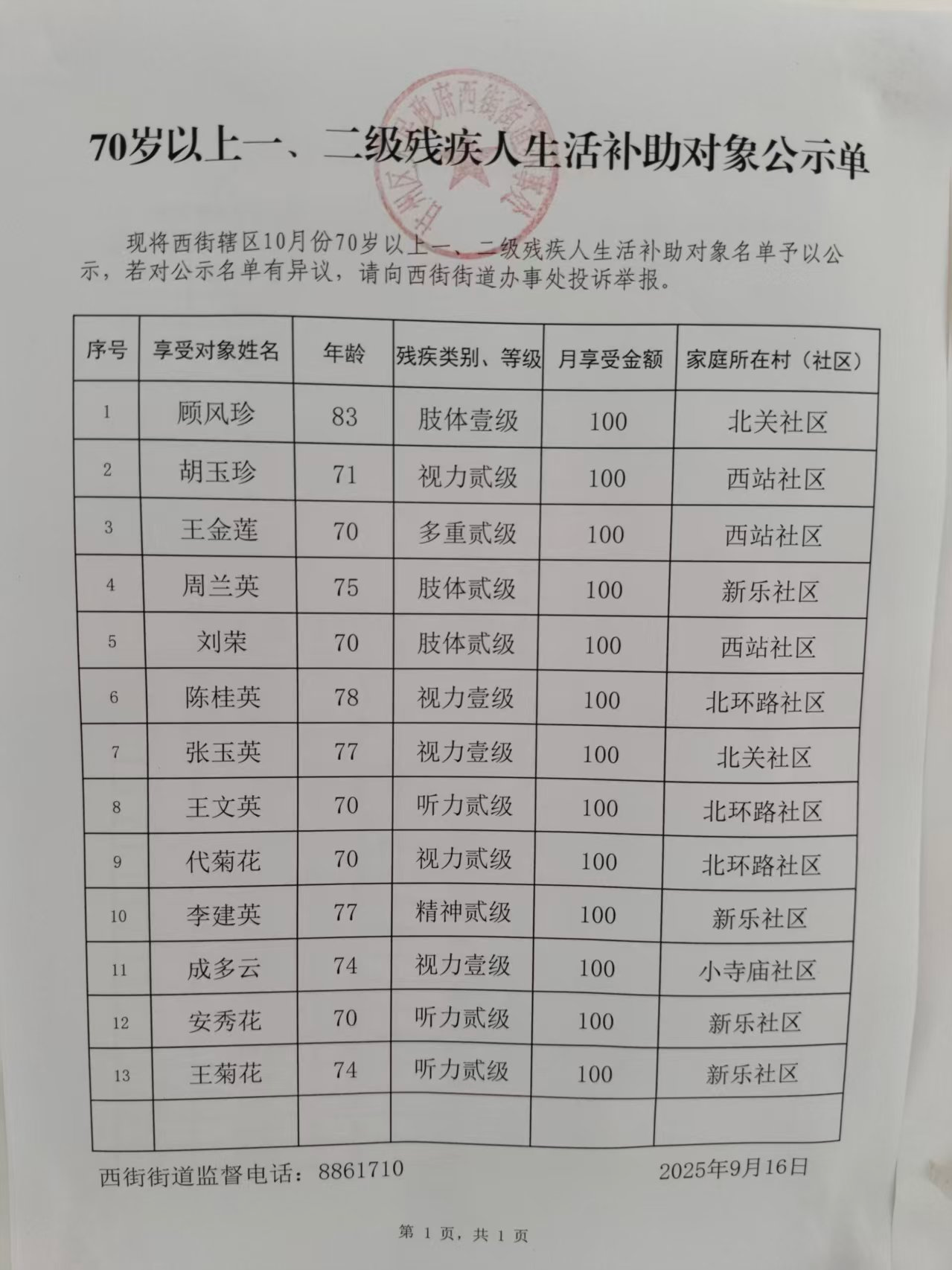 西街街道10月份70岁以上一、二级残疾人生活补助对象公示单