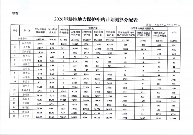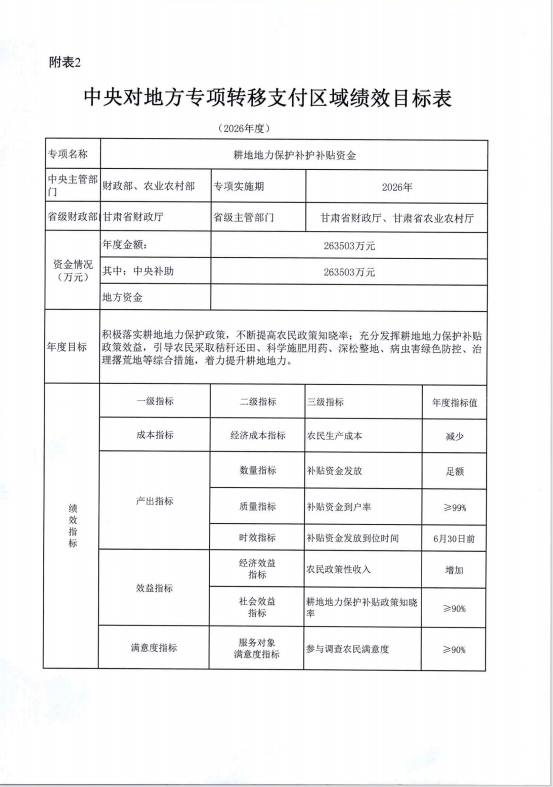 《2026年甘肃省耕地地力保护补贴工作实施方案》 及下达资金计划的通知