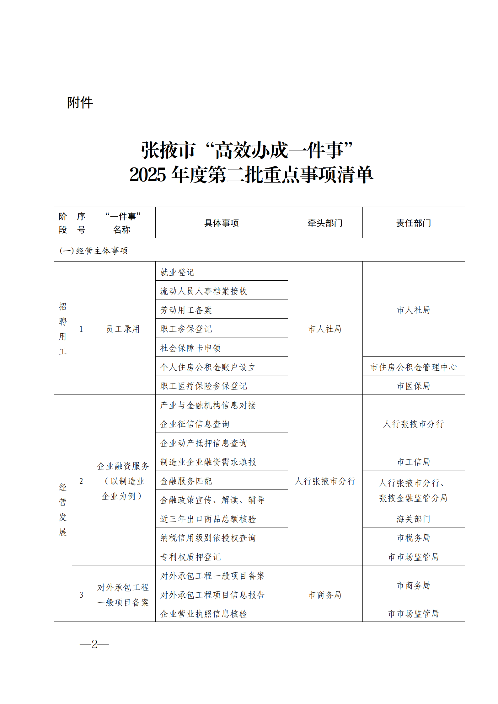 张掖市人民政府办公室关于印发张掖市“高效办成一件事”2025年度第二批重点事项清单的通知