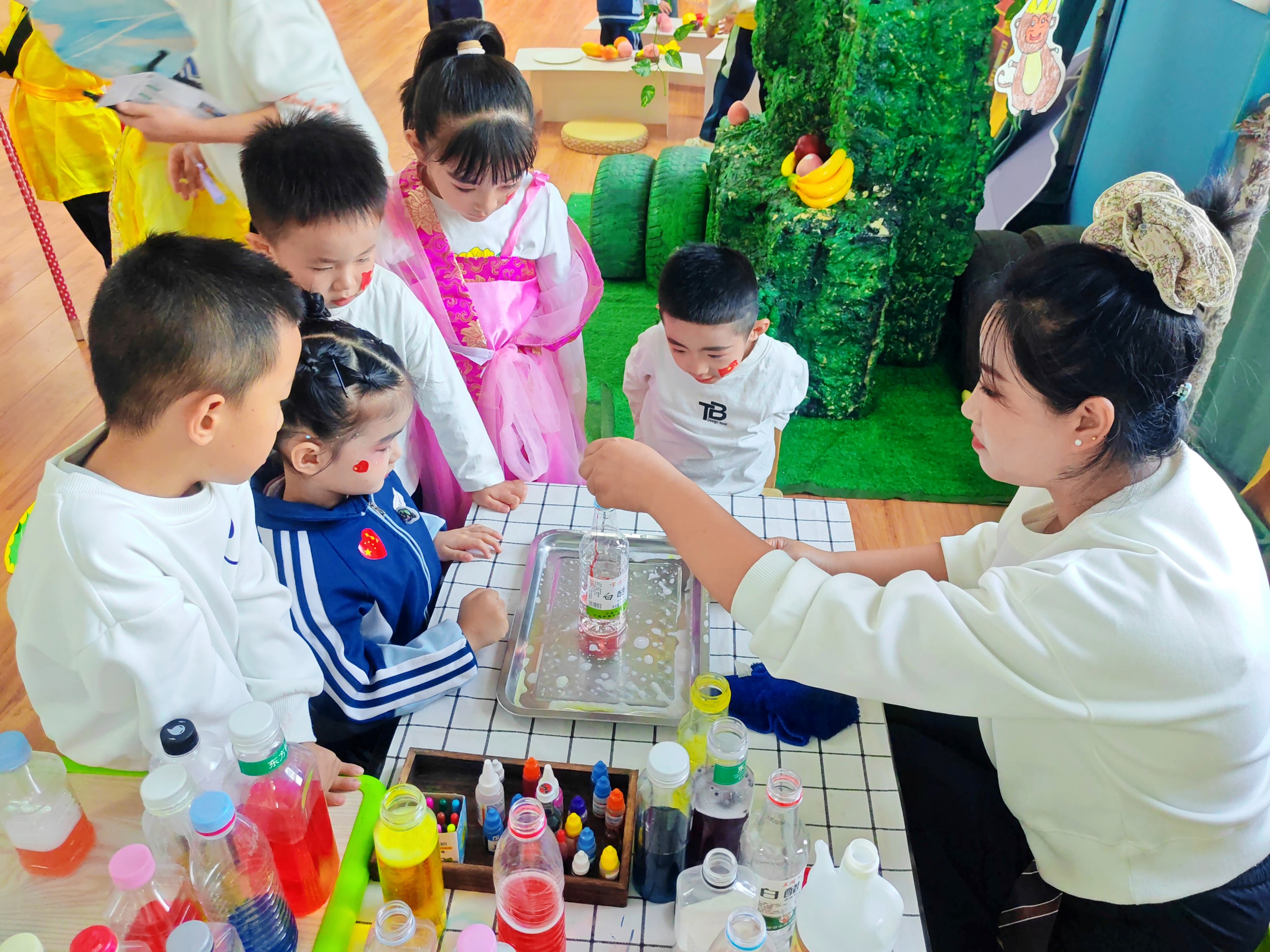 在活动过程中,小班家长和孩子们一起走进幼儿园,观看了幼儿园“健美养魄”活动成果展示,并带领幼儿共同开启了轻松愉快的亲子游园探馆活动。在幼儿园内庭院里,中班年级组的老师和小朋友们精心布置的科普展览场馆,深深吸引了小朋友和大朋友们的眼光,小小讲解员们自信大方地讲解,“巨大泡泡”“会飞的静电蜘蛛”等简单有趣、可参与的实验,让小观众们流连忘返。在大班各个功能室,老师们巧妙地把功能室主题与科学教育相融合,为孩子们提供了探索与实践的机会。漆扇制作、扎染印花、中医科学、光影探秘等活动,不仅吸引孩子们的眼光,更激发他们动手操作和探索的兴趣。“别害怕,试试看!”老师们鼓励的话语,为小班孩子们开启奇妙的科探之旅增强了信心和勇气。