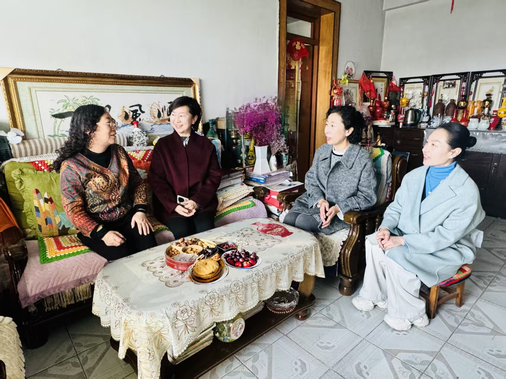 活动以“知重阳、创孝礼、融祖孙、传爱意”为主线,串联文化传承与亲情表达。教师通过故事讲解,向孩子们介绍“重阳节又名敬老节”的由来、“双九相重喻长久”的文化内涵及古人赏菊祈福的习俗,唤起幼儿对传统文化的兴趣。在“感恩创作时光”,孩子们专注制作菊花粘贴画、寿桃绘画、手工香囊,每一件作品都饱含童真与心意。祖孙互动环节将活动推向高潮:孩子们表演手势舞,用稚嫩肢体诠释传统美德;为祖辈捶肩揉背,用笨拙却真诚的动作传递关爱;端上亲手制作的“土豆泥蛋糕”,轻声诉说“爷爷奶奶、姥姥姥爷辛苦了,我爱您”,真挚举动让长辈们热泪盈眶。此外,幼儿园工会看望了退休老教师,话家常、忆过往,让敬老温情延伸至幼教前辈。