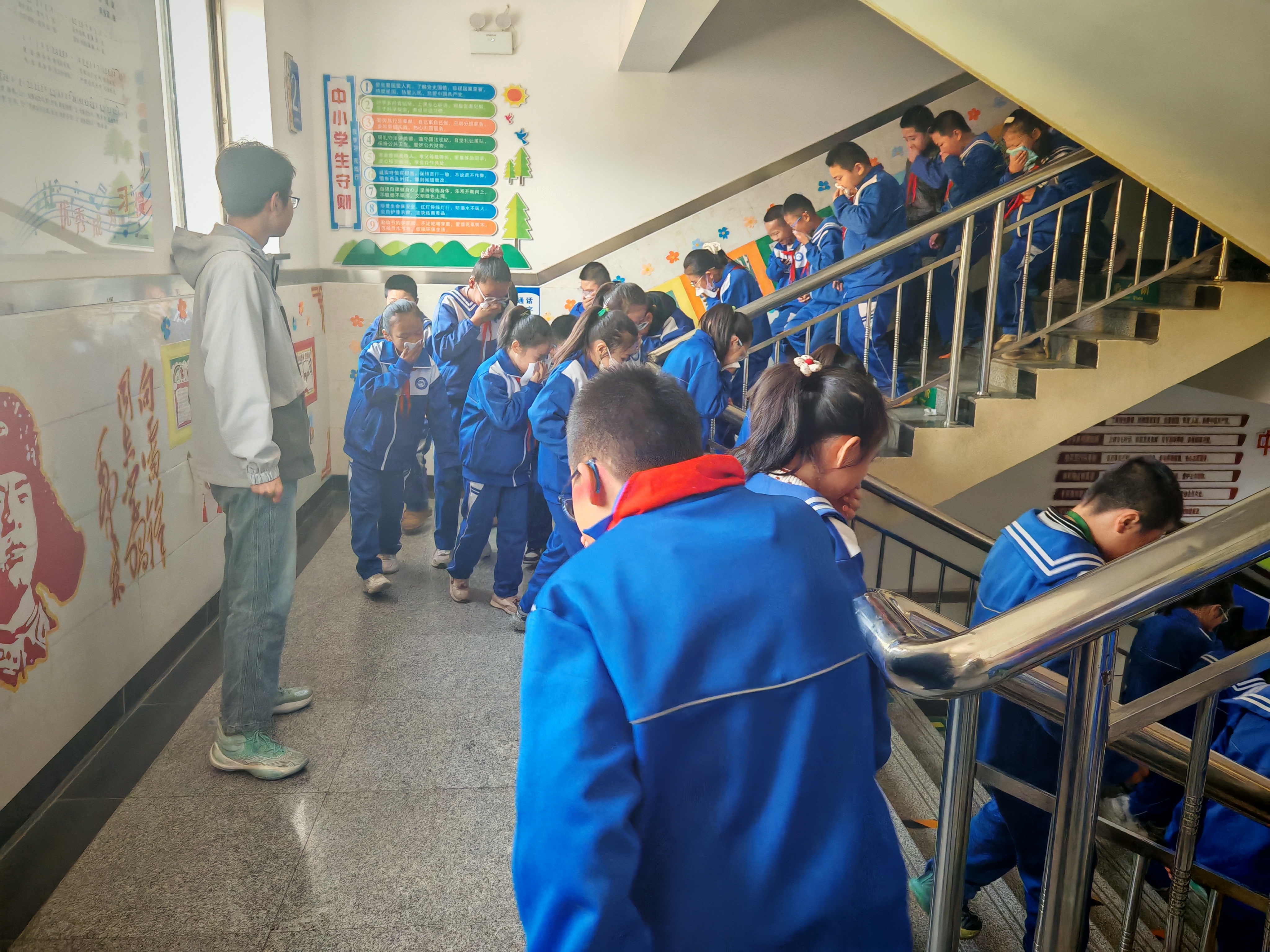 7日上午,各班主任通过趣味动画、实物演示等形式,为学生讲解了火灾报警流程、灭火器正确使用方法,以及教室、楼道等场景的逃生技巧——“弯腰捂鼻贴墙走,不推不挤不慌张”的口诀让学生们快速牢记核心要点。随着急促的消防警报声响起,演练正式启动。任课教师立即停止授课,组织学生用湿毛巾捂住口鼻,弯腰低姿,按照预定疏散路线,快速有序地撤离教室。楼道拐角处,值班老师专人疏导,提醒学生保持安全间距,避免拥挤踩踏;操场集合点,班主任迅速清点人数,及时向演练总指挥汇报,整个疏散过程紧张有序、规范高效,仅用2分49秒便完成全体师生安全集结。