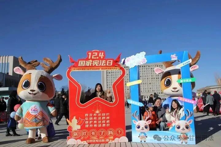 现场精心打造了主题鲜明的“宪法拍照打卡区”,以象征庄严与温暖的红色、蓝色为主色调,背景板上醒目呈现“学习宣传贯彻习近平法治思想,推动宪法深入人心”等核心标语,打造出庄重又不失活力的打卡场景,营造出沉浸式普法氛围。打卡区亮点纷呈,憨态可掬的“平平安安”卡通玩偶成为现场吸睛焦点,群众纷纷驻足参与,大人孩童争相与打卡框、卡通玩偶合影,让法治理念随一张张照片广泛传播,打卡区成为了流动的普法阵地。