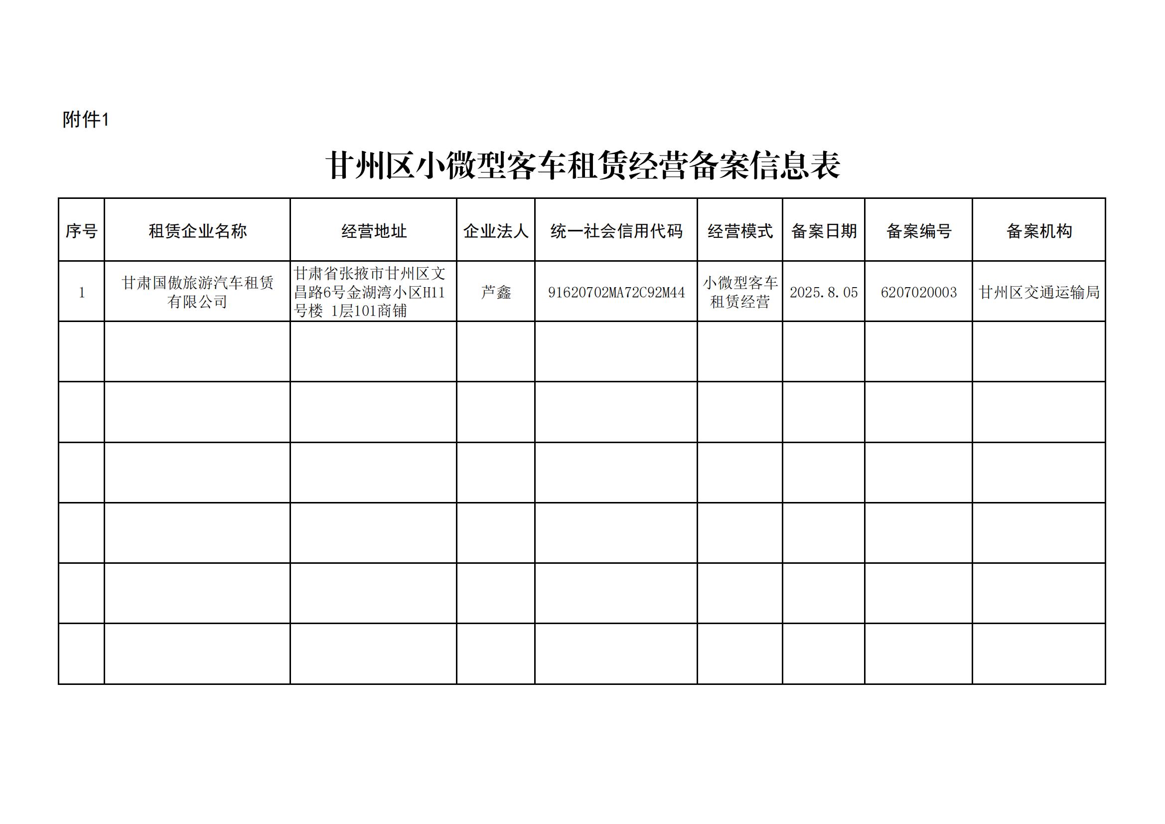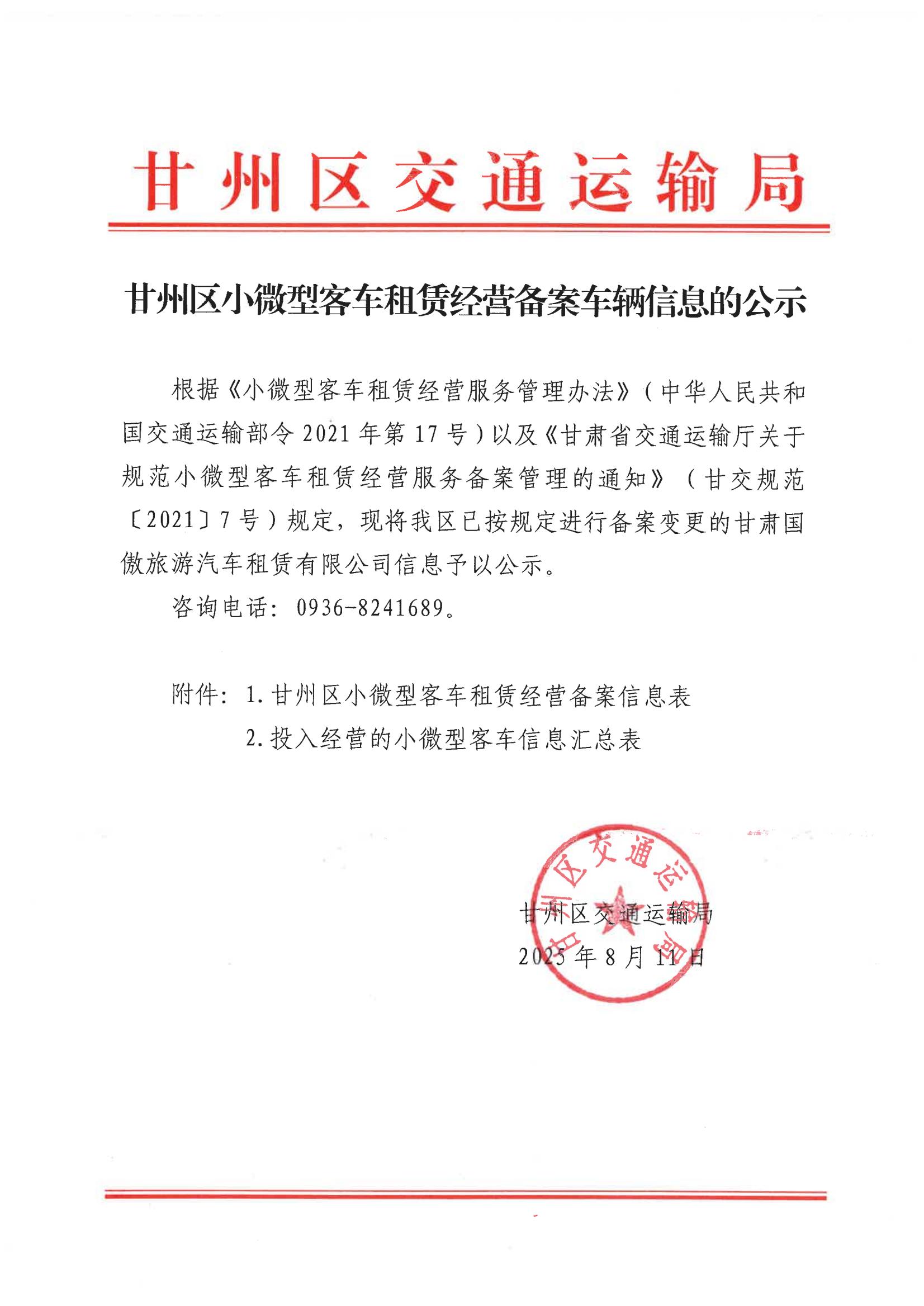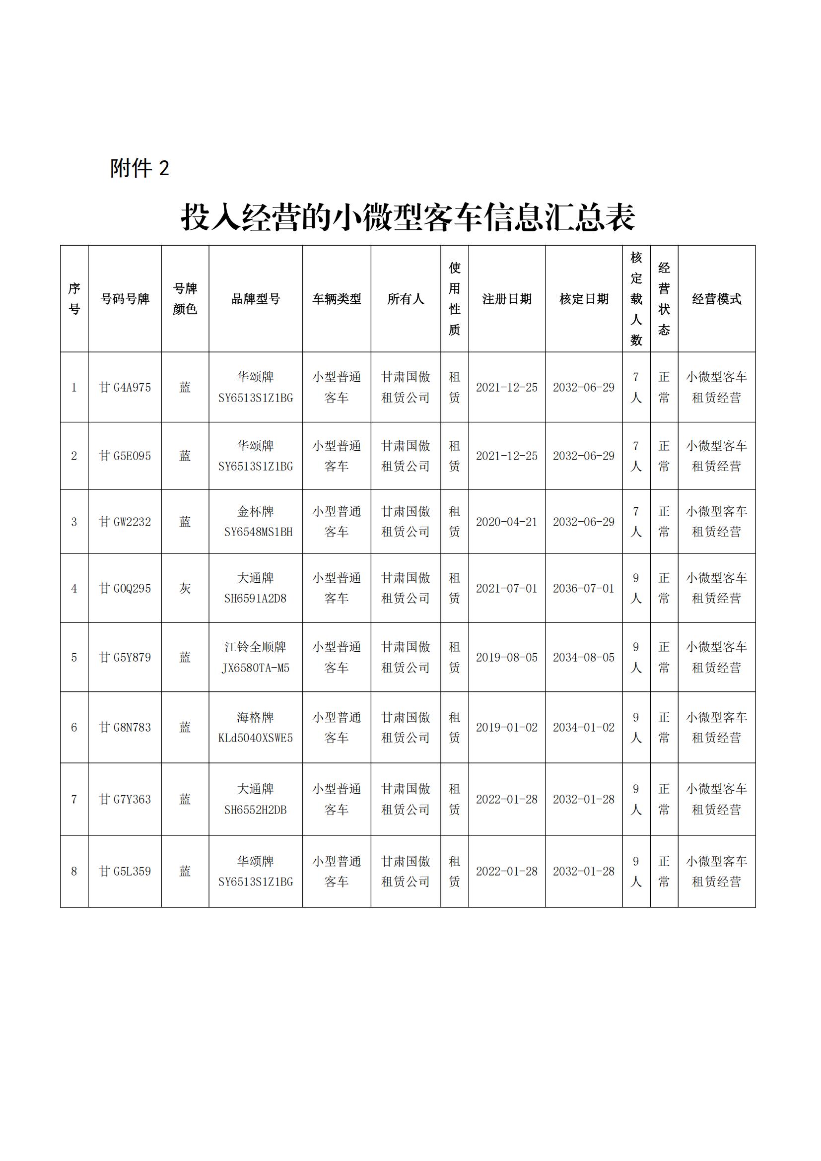 甘州区小微型客车租赁经营备案车辆信息的公示